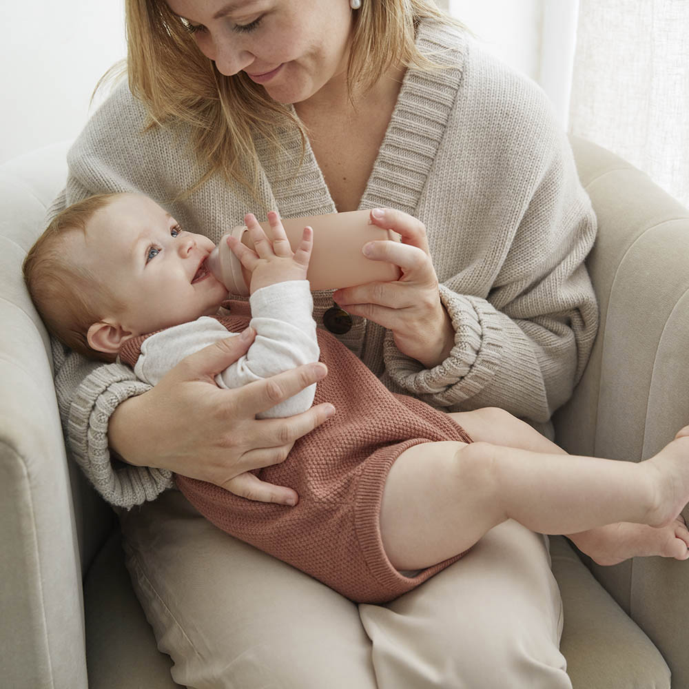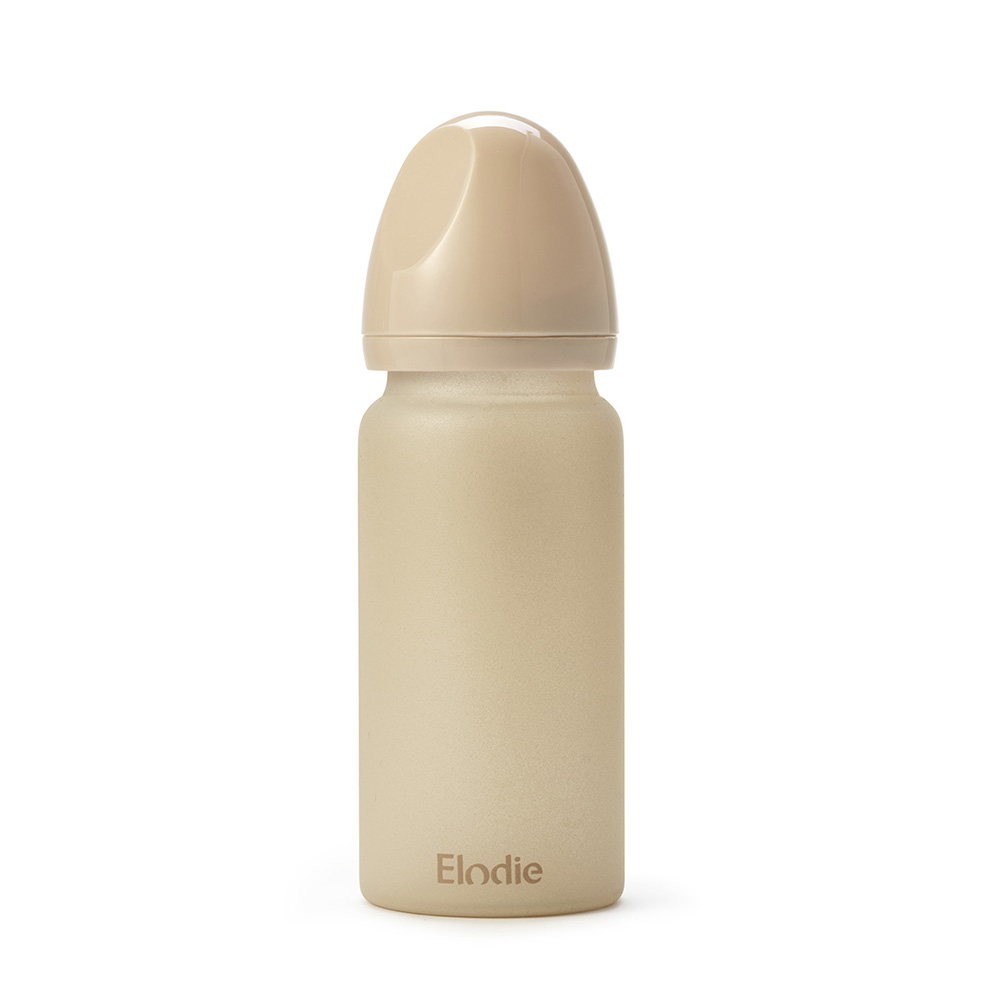 Elodies nappflaska är tillverkad av temperaturbeständigt borosilikatglas med ett skyddande hölje av livsmedelsklassad silikon. Materialet gör flaskan lätt, tålig och reptålig, samtidigt som den är helt fri från skadliga ämnen. Den tål både frysning och sterilisering i kokande vatten, vilket gör den till ett tryggt och praktiskt val för ditt barn.