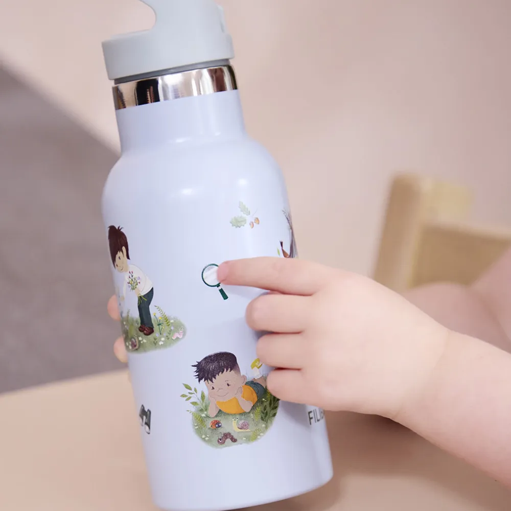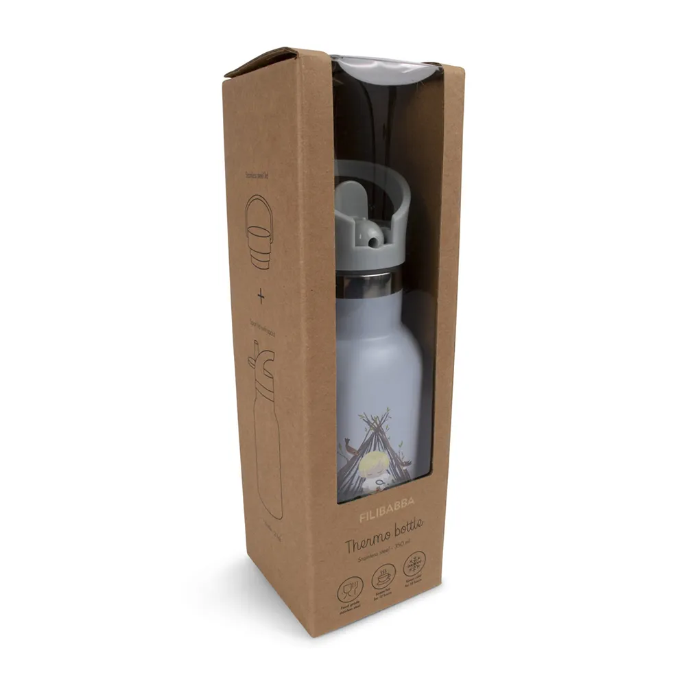 Filibabbas termorflaska erbjuder både ett traditionellt skruvlock och ett lock med inbyggt sugrör, vilket gör den idealisk för barnets alla äventyr. Tillverkad av rostfritt stål, garanterar den att din dryck behåller sin temperatur under lång tid. Termosflaskan är elegant designad med ett lekfullt motiv. För att förlänga flaskans livslängd rekommenderas handdisk.