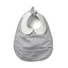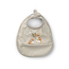 Den breda passformen täcker både axlar och bröst, och den flexibla fickan framtill fångar upp smulor och spill. Haklappen fästs med ett mjukt kardborreband i nacken, vilket gör att halsvidden kan justeras efter behov.