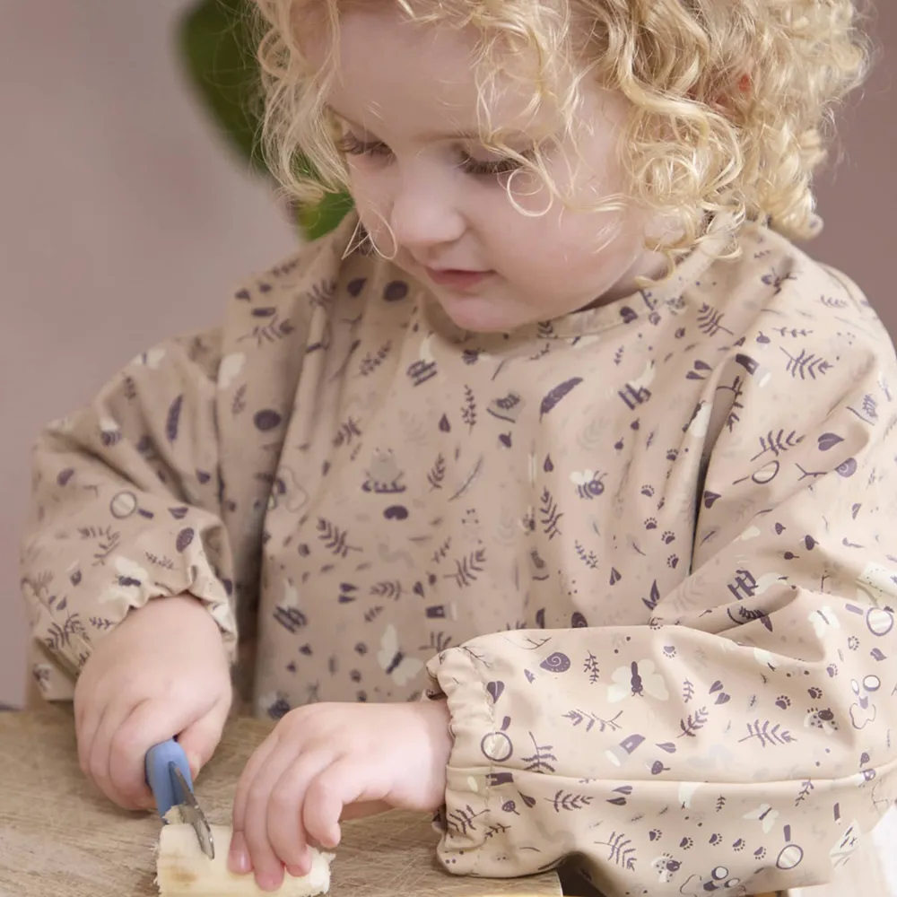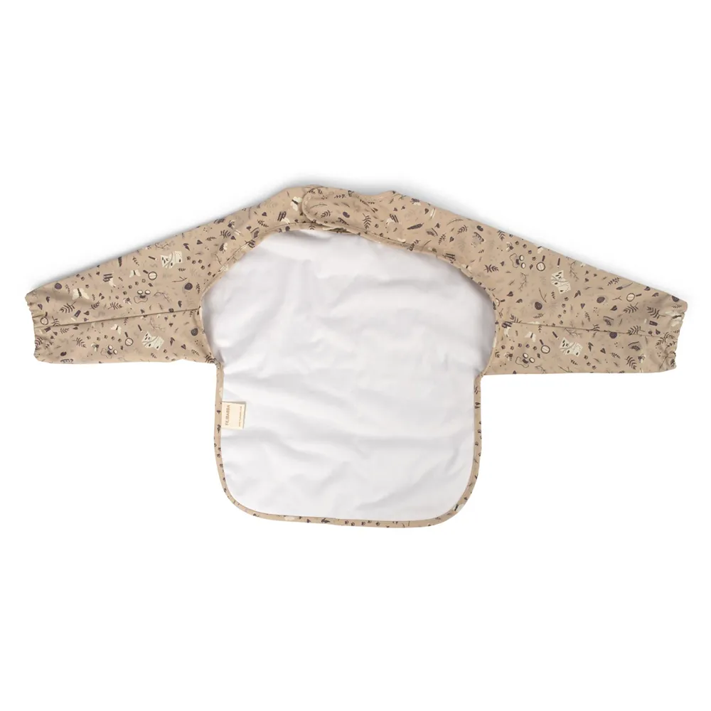 Filibabbas vackra haklapp med ärmar är den perfekta följeslagaren vid måltider. Med en generös ficka i botten fångar haklappen upp mat och vätska, och den justerbara resåren vid handlederna tillsammans med kardborreknäppningen i nacken säkerställer en perfekt passform för ditt barn. Den mjuka ytan gör haklappen både bekväm att bära och enkel att rengöra.