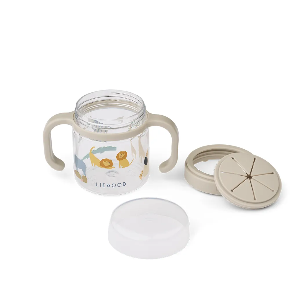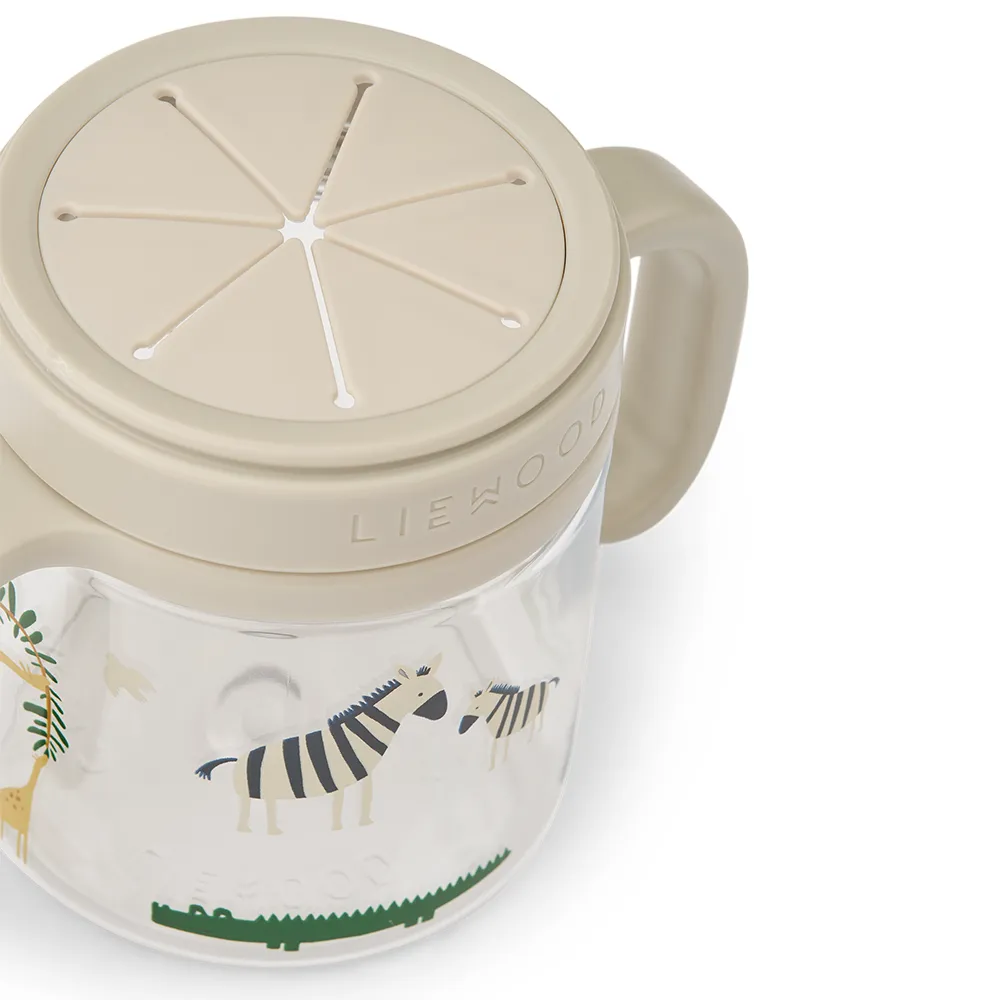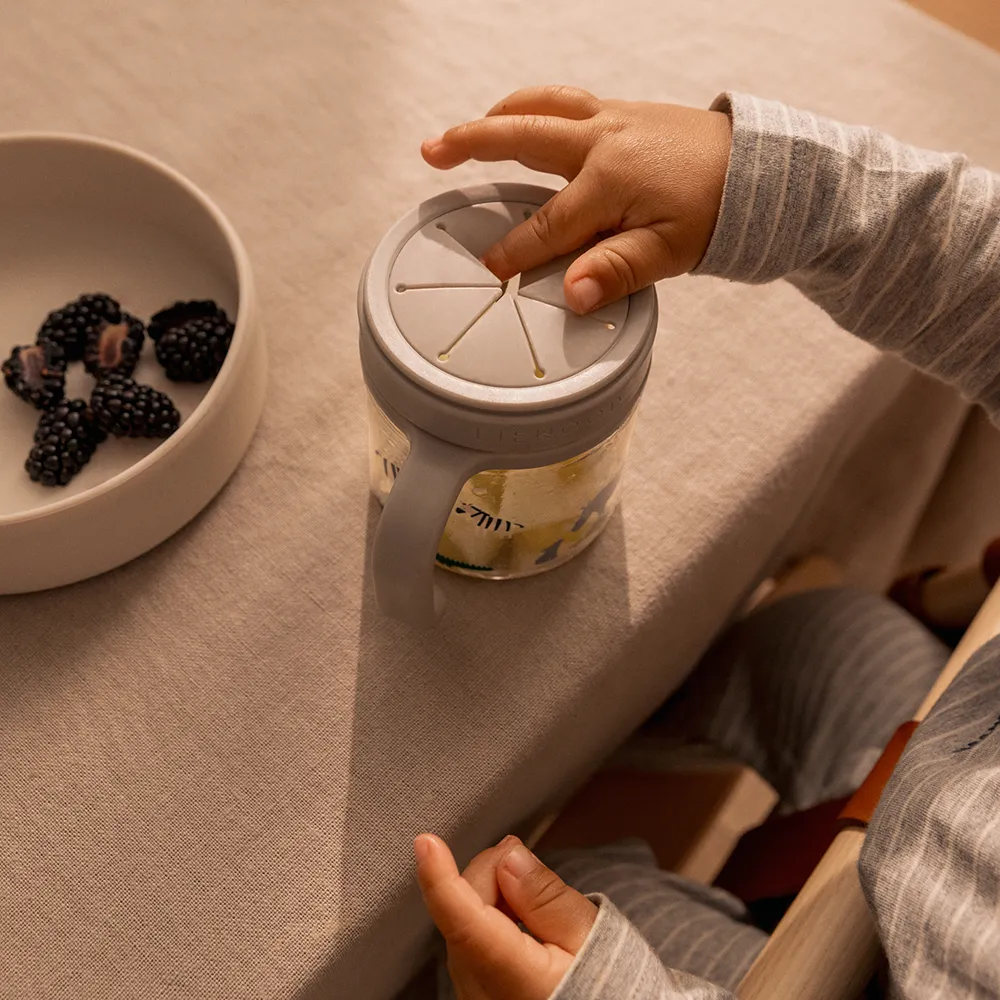 Liewood Enyo snack cup är en lekfull och smart mellanmålsskål för barn, designad för att göra små pauser enklare och mindre kladdiga. Skålen är tillverkad i tåligt och okrossbart Tritan-material och rymmer 280 ml – lagom för frukt, kex eller små snacks på språng.