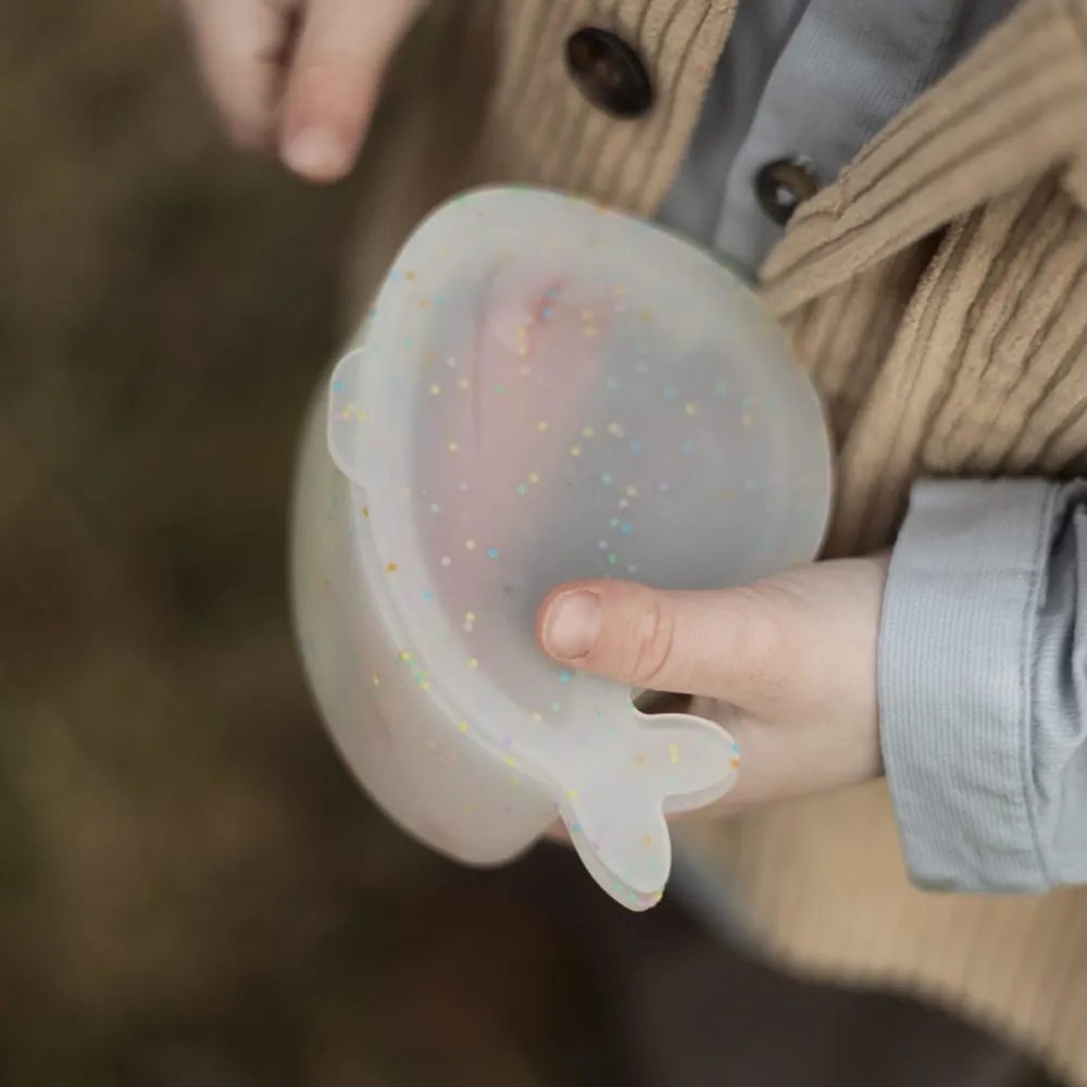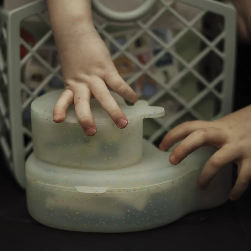 Snackslådorna är inte bara praktiska utan också lekfulla, med en konfettieffekt inbäddad i det mjuka silikonet. Det gör varje picknick till en festlig och färgglad upplevelse!