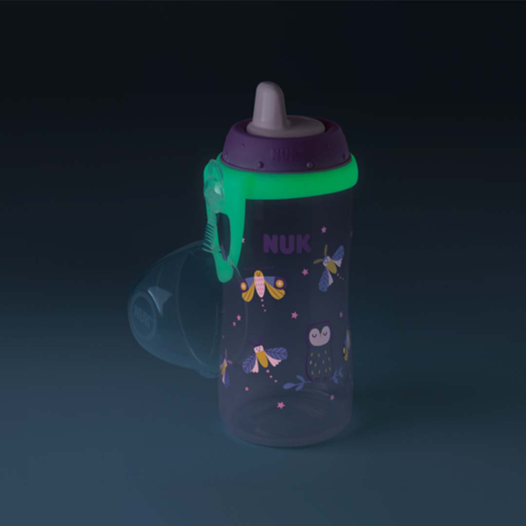 NUK Kiddy Cup Glow in the dark är en praktisk flaska med extra tålig drickpip. NUK Kiddy Cup rymmer 300 ml och är spillfri. Flaskan är utformad för att passa i små barns händer. Lyser i mörker.