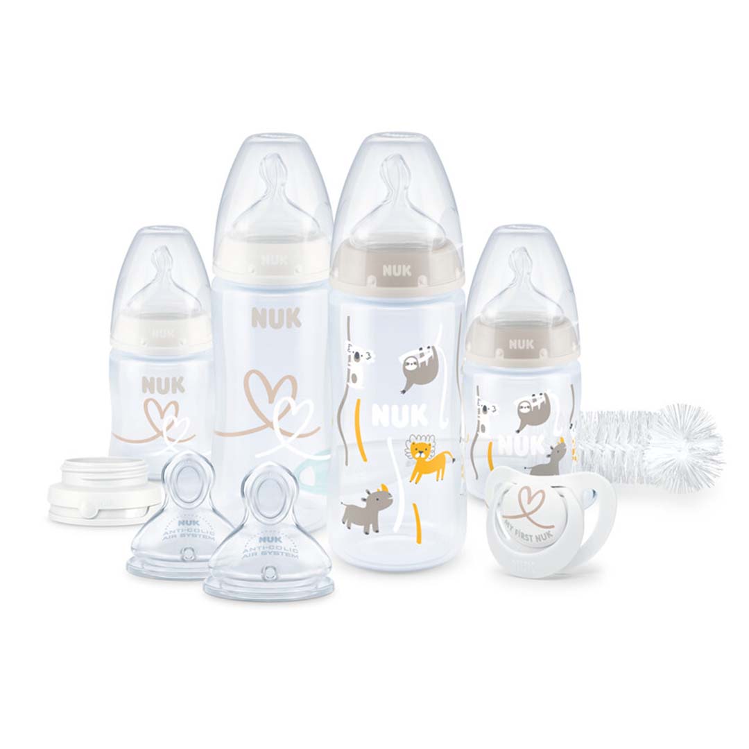 NUK First Choice+ Perfekt Start Set innehåller 4 st nappflaskor, extra dinappar i stl M, ett spillfritt lock till flaskorna, en My First NUK-napp och en flaskborste med praktik 2i1-funktion. Ett perfekt startset för barn 0-6 månader och en uppskattad present till blivande föräldrar.