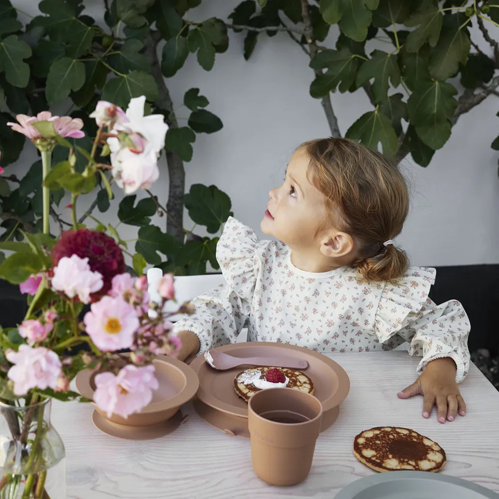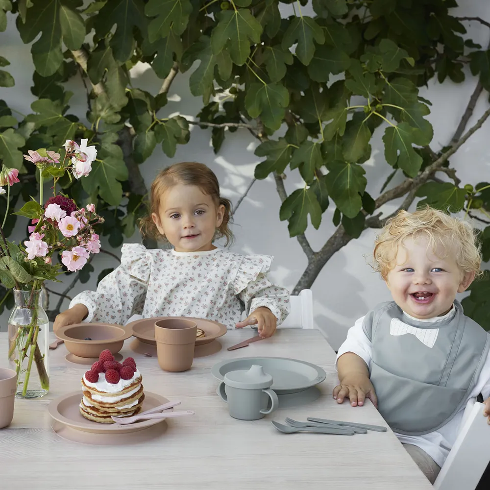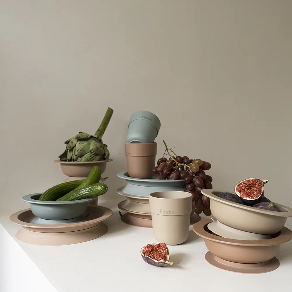 Elodie Details 3-delars barnservis är ett perfekt set för små barn som utforskar fast föda och vill lära sig att äta själva. Setet inkluderar en tallrik, skål och mugg, och de smarta, avtagbara sugkopparna ser till att både skålen och tallriken sitter stadigt på alla plana ytor – vilket minskar risken för spill. Servisen är tillverkad i miljövänligt PLA-material, en bioplast från förnybara resurser som majs och kassava, vilket gör den till ett mer hållbart alternativ. Alla delar är fria från BPA, ftalater och PVC, och både mikrovågsugn och diskmaskinssäkra för enkel användning och rengöring.