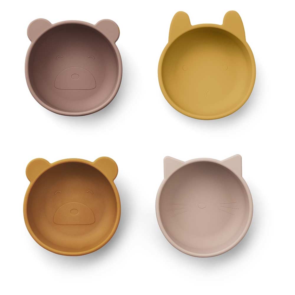 Ett 4-pack silikonskålar med olika färger och motiv och gör måltiden lite roligare! Skålarna är tillverkade av 100% silikon och är BPA-fria. Praktiska då de inte går sönder om de åker i golvet.