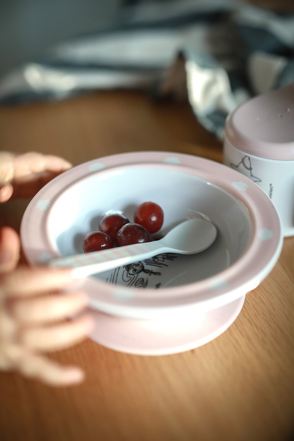 Gör måltiderna lite magiska med denna slitstarka sugkoppstallrik prydd med älskade Muminmotiv, skapade av den ikoniska konstnären och författaren Tove Jansson. Tillverkad i reptålig melaminplast och försedd med en praktisk silikonring undertill står tallriken stadigt på bordet – perfekt när små händer lär sig äta själva.
