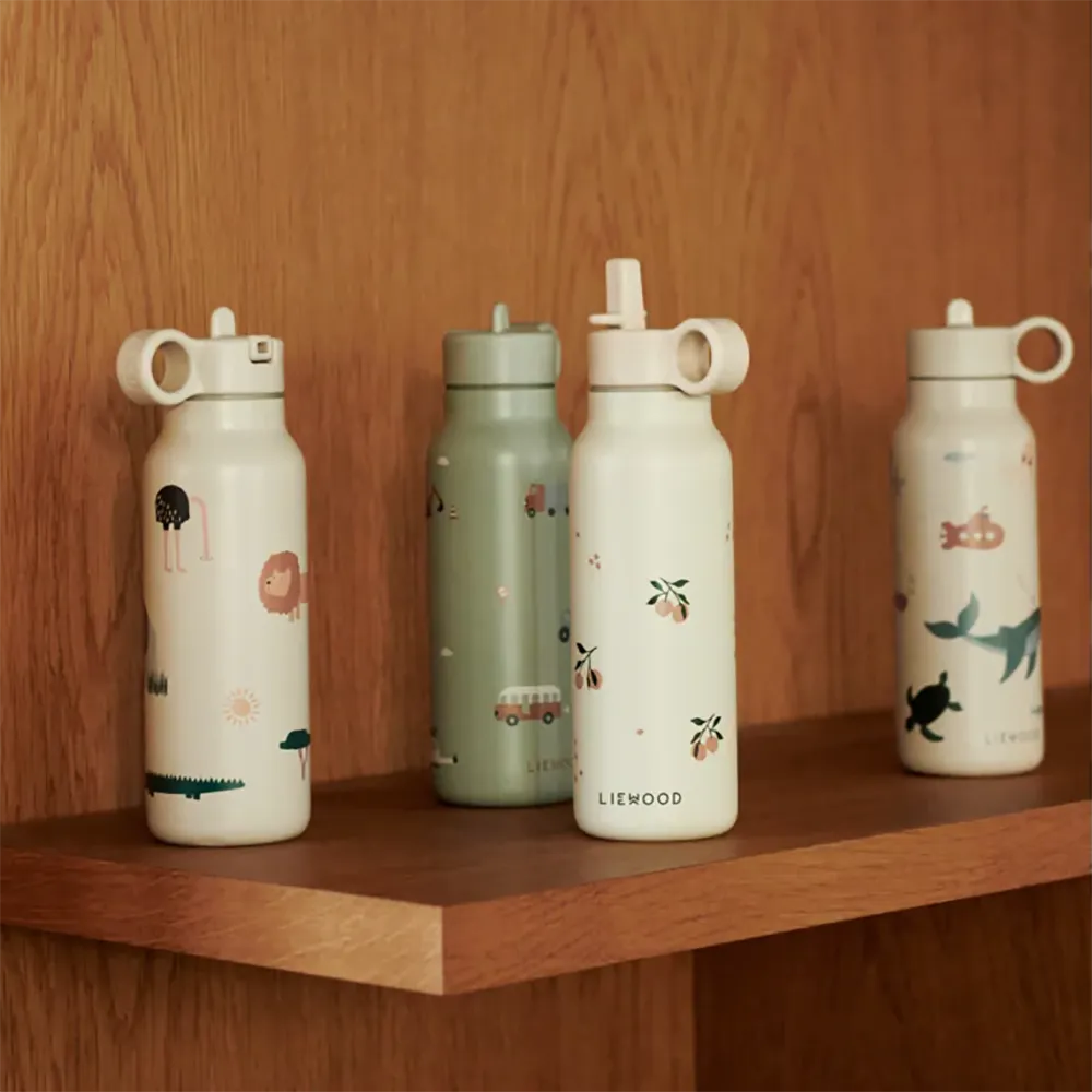 Falk vattenflaska från Liewood är en smart och stilren flaska tillverkad i 80 % återvunnet rostfritt stål. Den är utformad för att vara lätt att hålla för små händer och passar perfekt för både skoldagar och utflykter. Den praktiska pop-up-korken med inbyggt sugrör gör det enkelt för barnet att dricka själv, och det medföljande handtaget gör flaskan smidig att bära med sig.