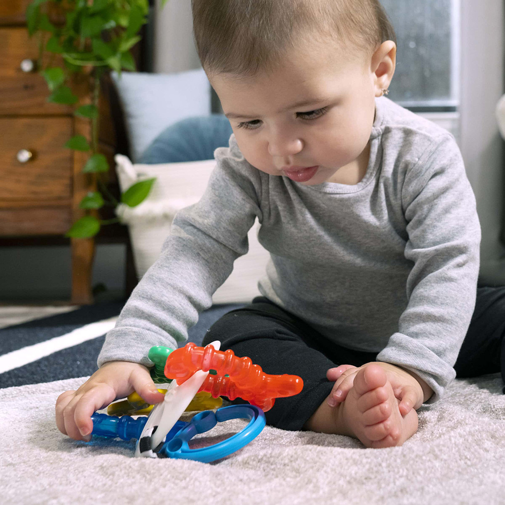Baby Einstein Ocean Explorers Sea of Sensory Bitringar är ett set med 4 havs-temade bitringar som lindrar bebisens ömma tandkött och engagerar med sina livliga färger och unika texturer. Setet innehåller 4 bitringar i form av havsdjur, varav 2 är fyllda med vatten och kan kylas för extra lindring vid tandning.
