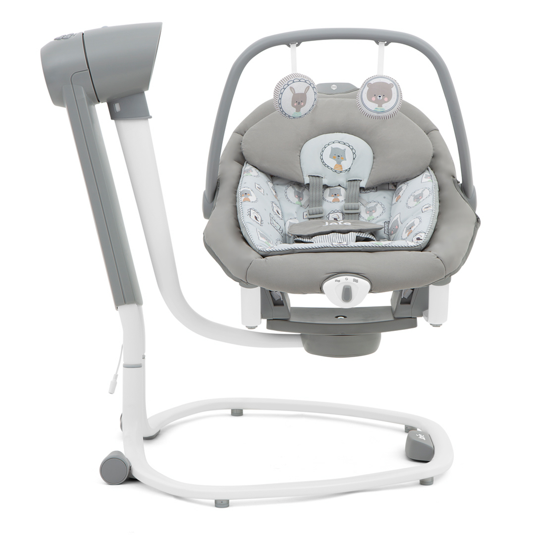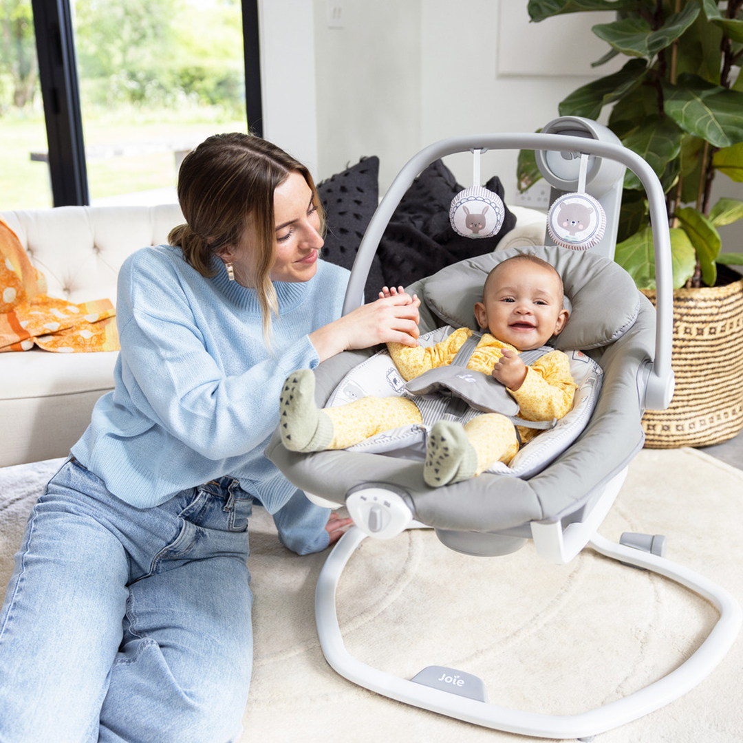 Denna härliga babysitter svänger och gungar precis som barnet vill! Joie's Serina 2-in-1 babysitter i grått erbjuder en mjuk och rogivande gungfunktion. Den har lugnande ljuseffekter och musik för att skapa en avslappnande atmosfär för ditt barn. Med tre olika lutningslägen, ett bekvämt handtag, två lättrullade hjul och en lekbåge med två leksaker, är denna babysitter både praktisk och underhållande och är även lyftbar och fungerar som en bärbar babysitter för extra bekvämlighet
