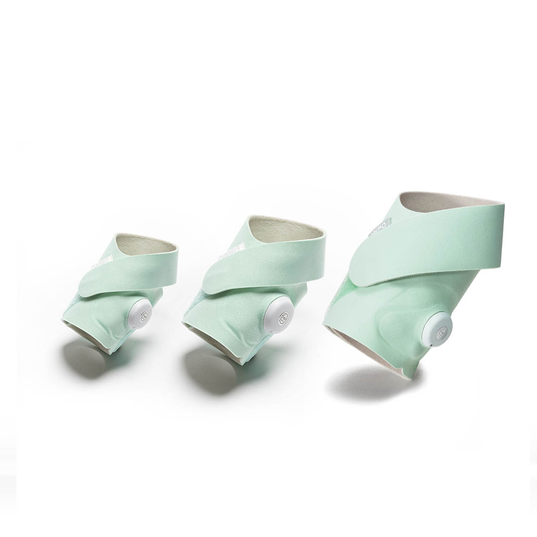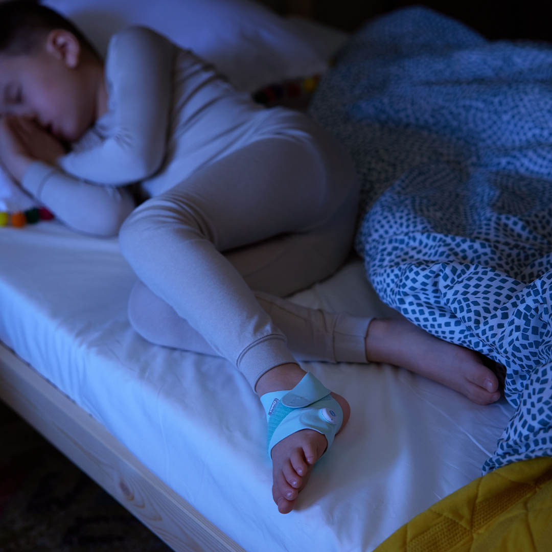 Smart Sock sitter bekvämt runt ditt barns fot för att mäta hjärtfrekvens, syrehalt och sömn med beprövad pulsoximeter teknologi.