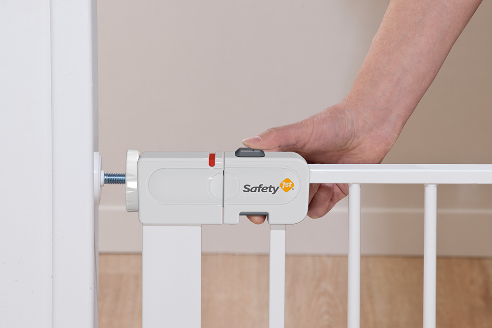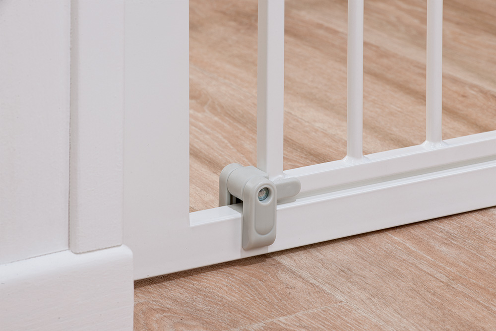 Denna breda barngrind, som kan öppnas i båda riktningarna, är enkel att använda, samtidigt som en dubbel låsningsmekanism ger ökad säkerhet. Det är en självslutande grind som passar för öppningar mellan 73 cm och 80 cm, men kan förlängas upp till 136 cm med separat tillgängliga förlängningar.