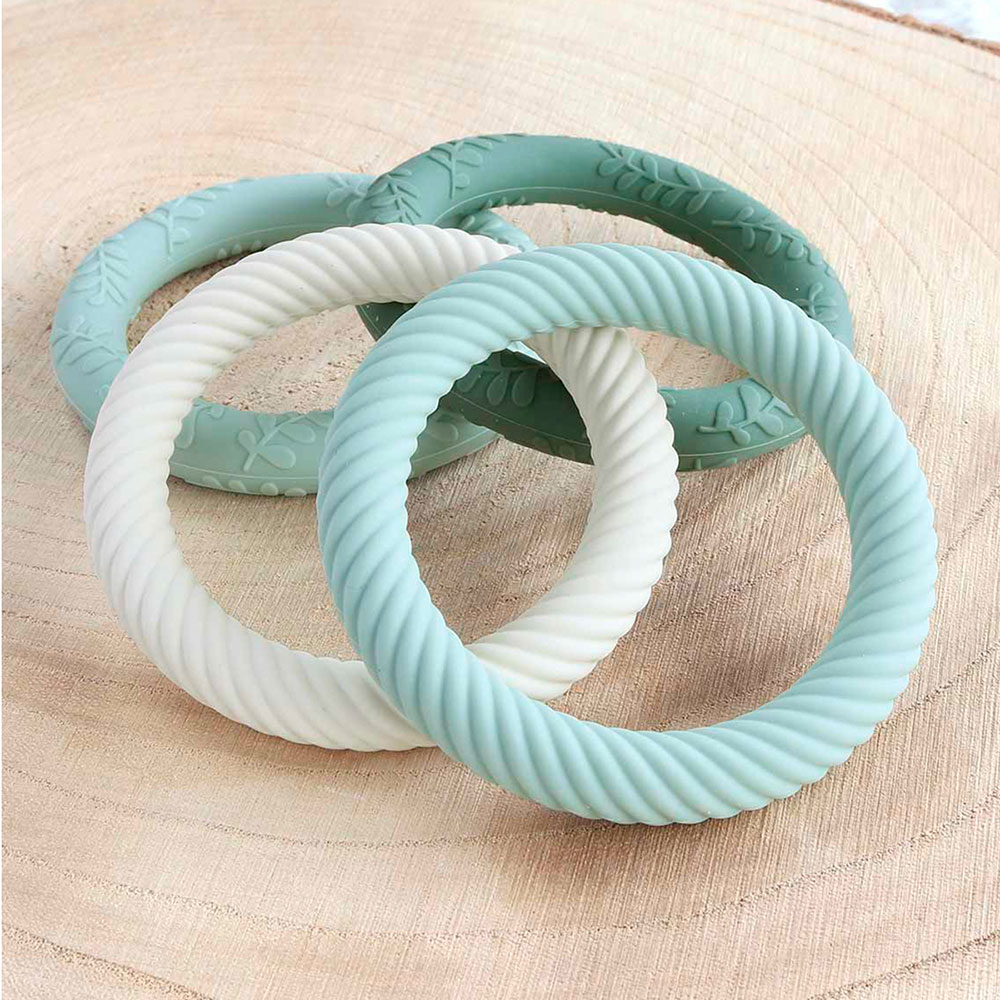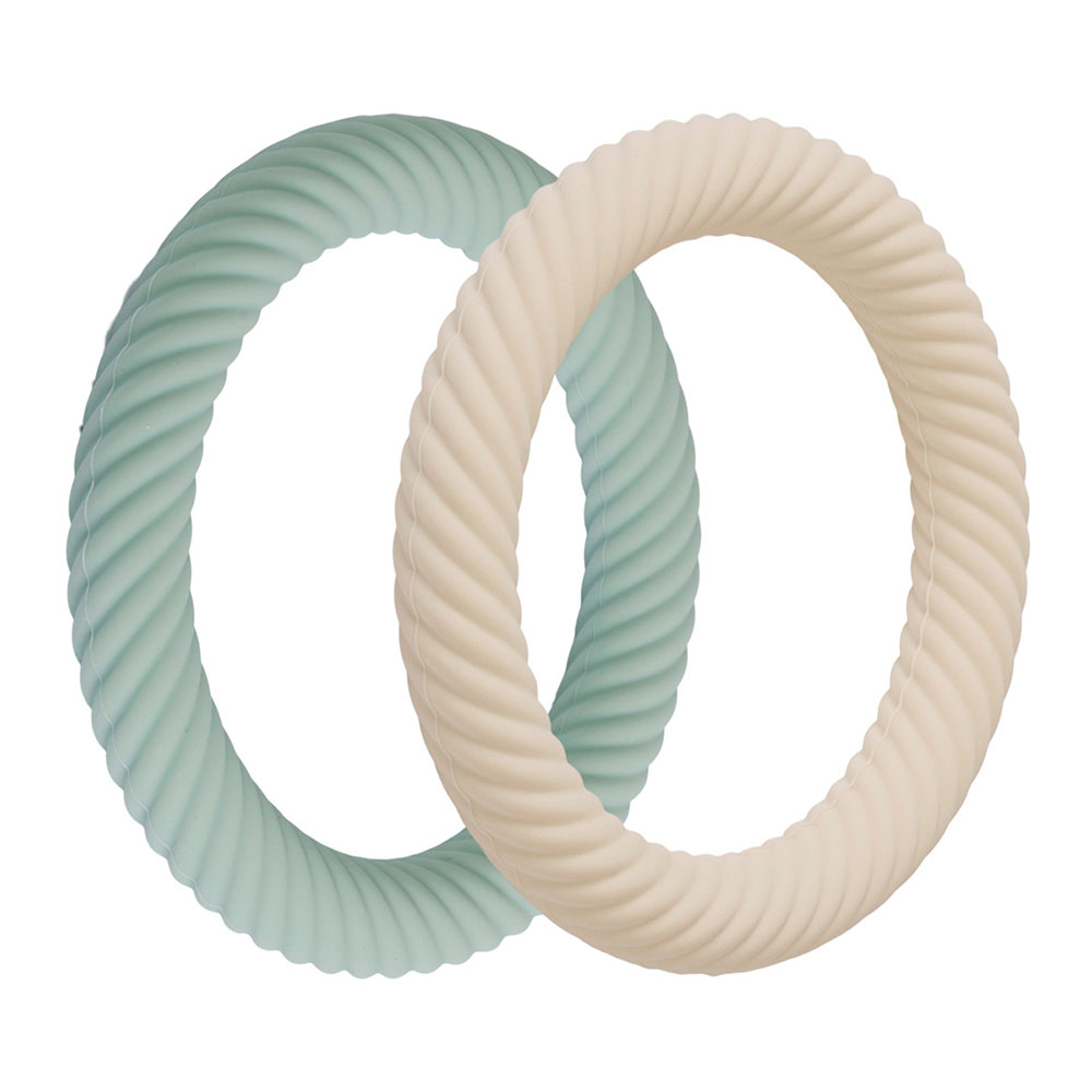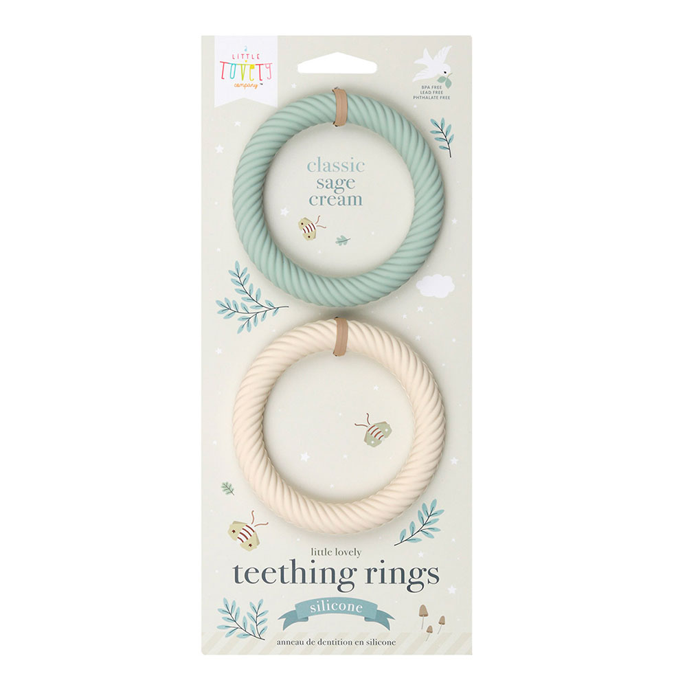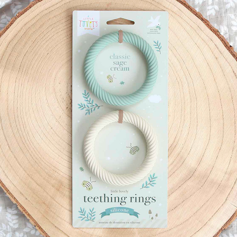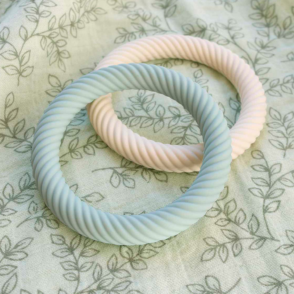 Ett set med två små vackra bitringar. Tillverkade av 100% ofarligt livsmedelsklassat silikon är de idealiska för små händer och lindrar ömma tandkött.