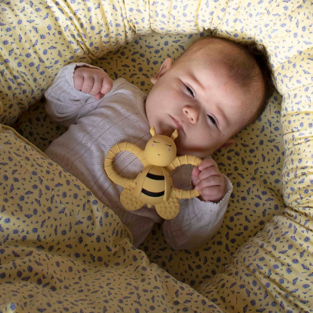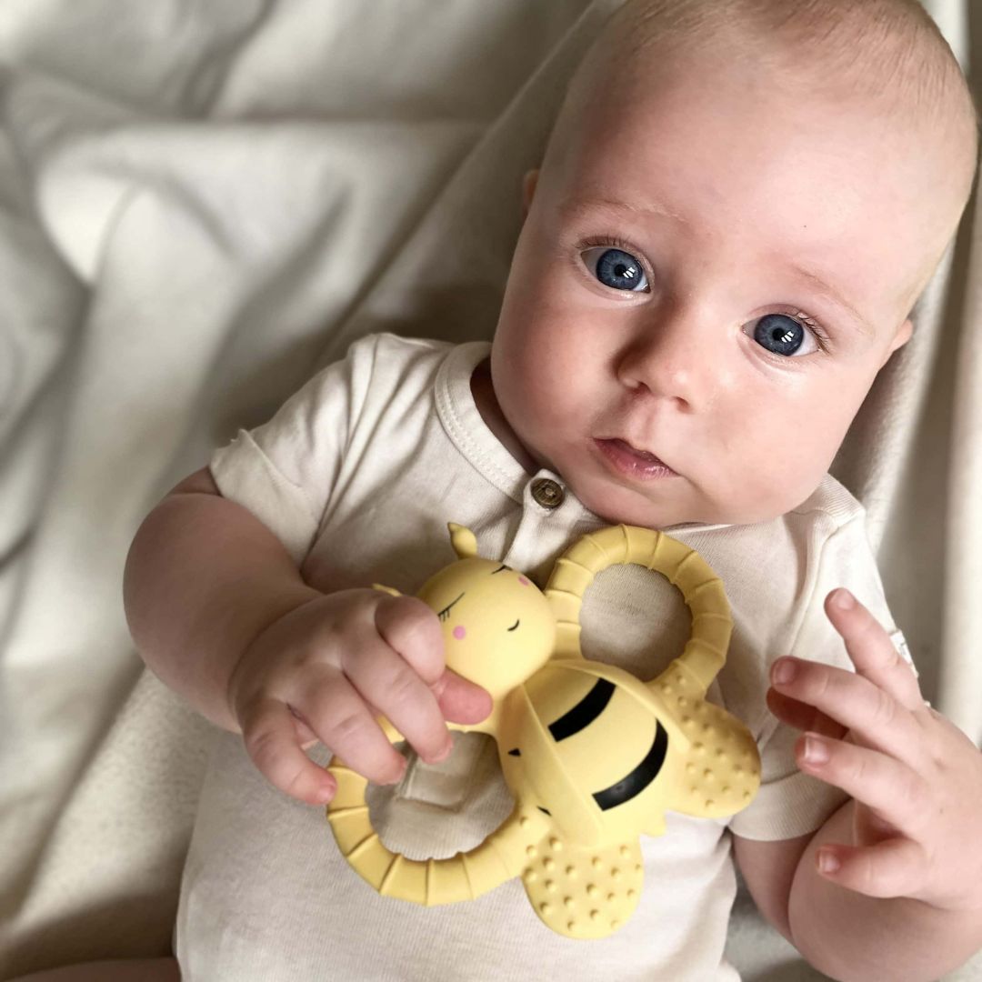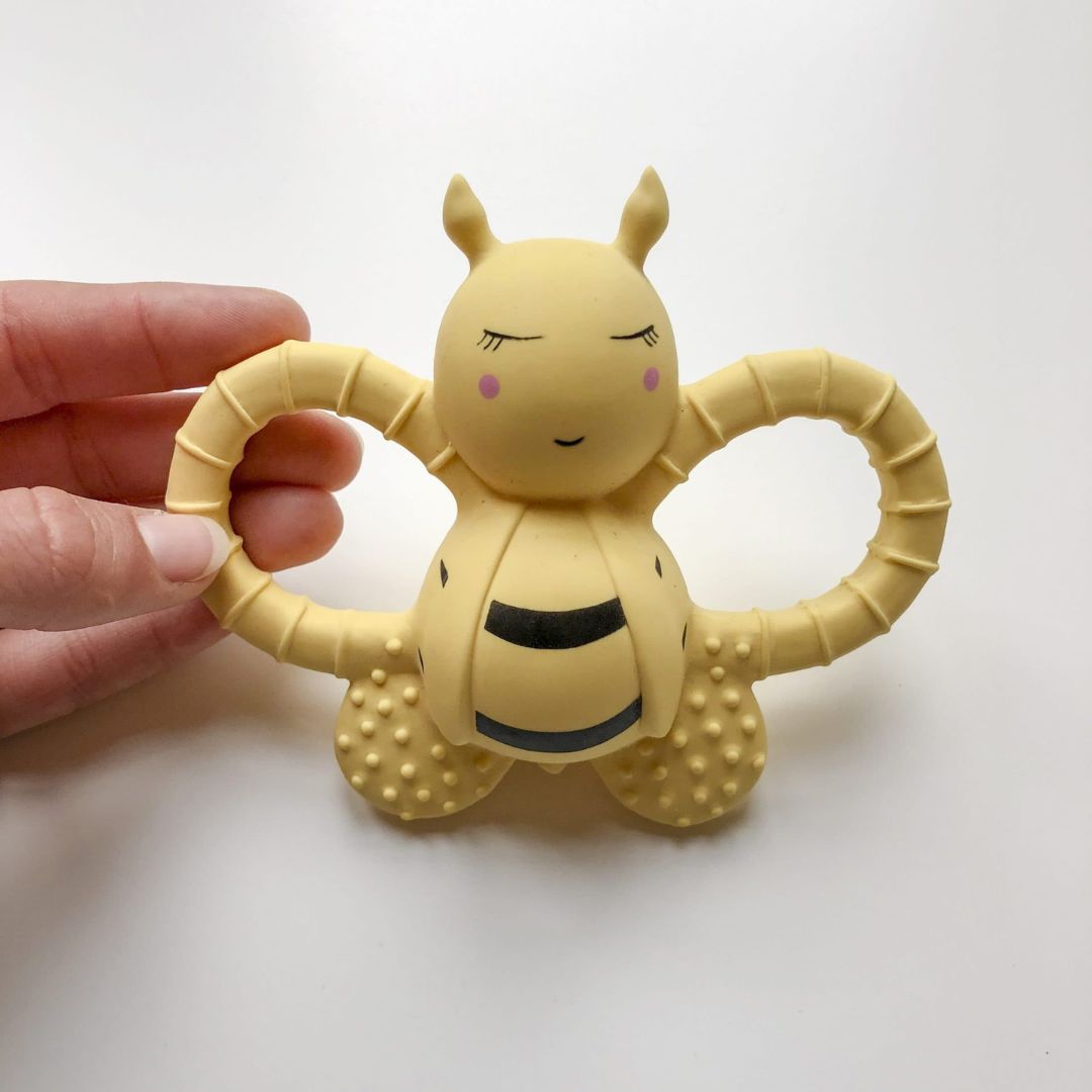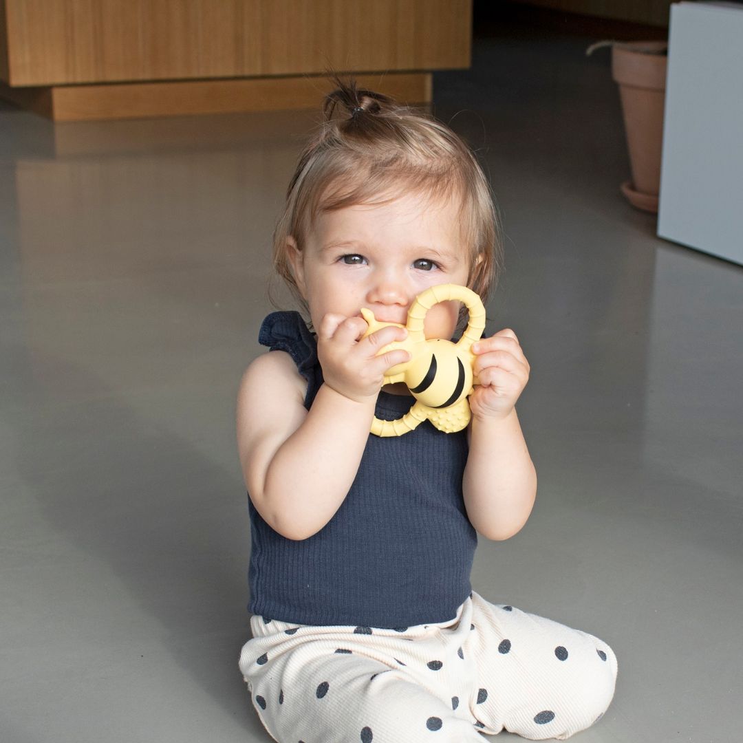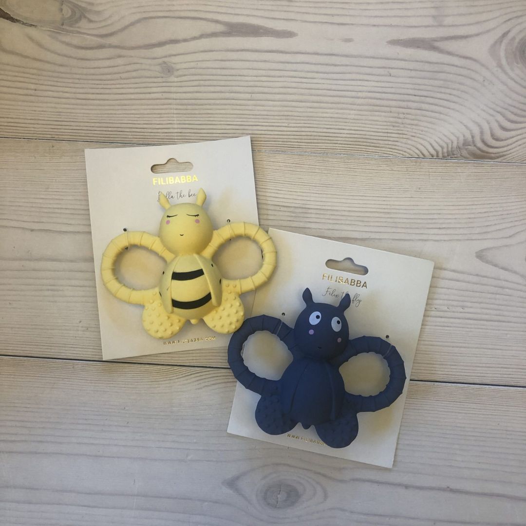 Bitring från danska Filibabba - ger ett bra grepp för små små händer. På ytan finns små prickar och alla kanter är mjuka, vilket kan hjälpa mot ömt tandkött och samtidigt stimulera det taktila sinnet. Bra produkt för att utveckla barnets finmotorik. Eftersom bitringen är handgjord kan uttrycket variera något från bilden.