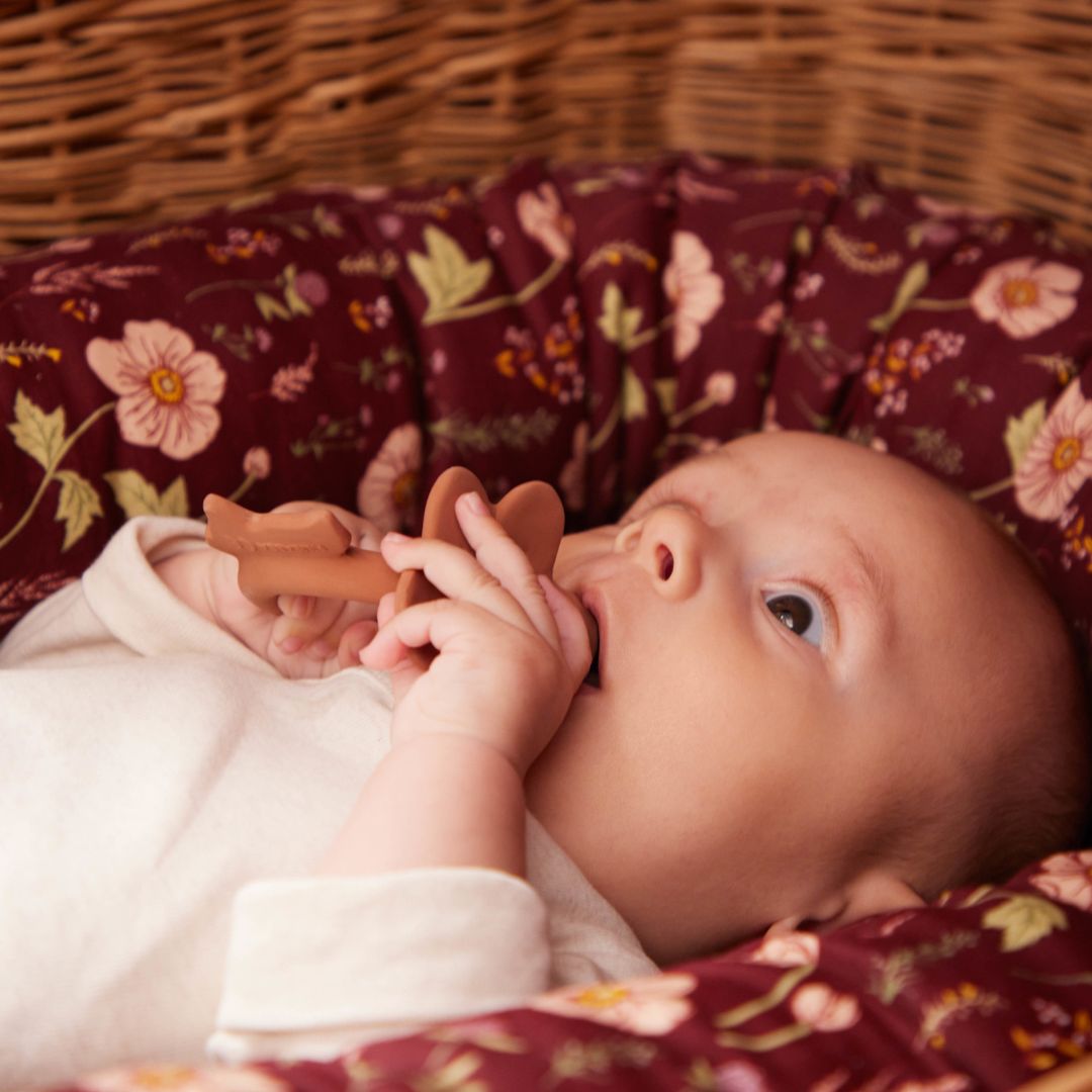 Denna fina bitring med blomma är formad efter en vacker mjukrosa japansk anemon. Bitringen är utformad med massor av spännande texturer och former som stimulerar ditt barns mun och händer. Designen gör det enkelt för barnet att greppa tag i och tugga på bitringen. - Tillverkad av 100% naturgummi och är gjord i ett stycke utan hål eller ventiler. Detta förhindrar att bakterier eller smuts tränger in i bitringen. Denna bitring är noggrant testad och godkänd enligt den europeiska säkerhetsstandarden för leksaker; EN71.