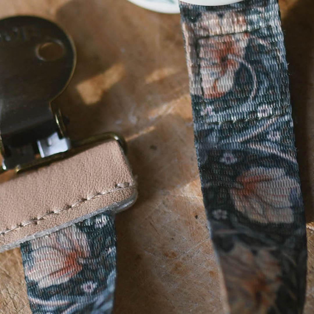 - Fäst metallklämman på barnets kläder och silikonringen på nappen för att säkerställa att nappen inte går förlorad eller hamnar på marken. Detta är en ovärderlig hjälp i vardagen. Elodie erbjuder ett brett sortiment av napphållare, från enfärgade till vackert mönstrade, alla med dekorativa detaljer i veganskt läder. Varje napphållare har även en matchande napp från Elodie.
