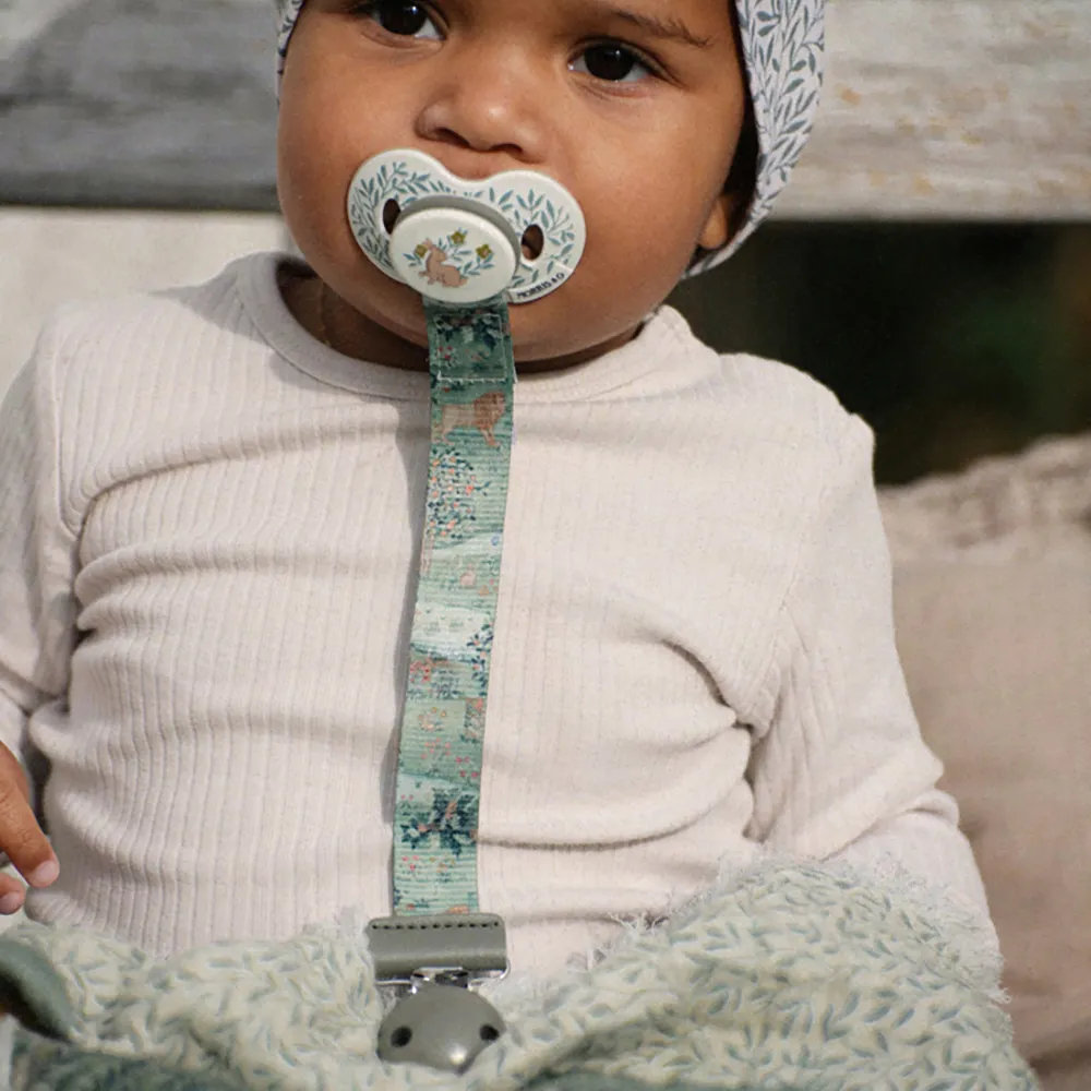 Elodie Details napphållare i trä är en praktisk och stilren lösning för att hålla barnets napp ren och inom räckhåll. Fäst klämman på barnets kläder och använd den elastiska silikonringen för att säkert fästa nappen. Detta förhindrar att nappen tappas bort, smutsas ner eller faller till marken.