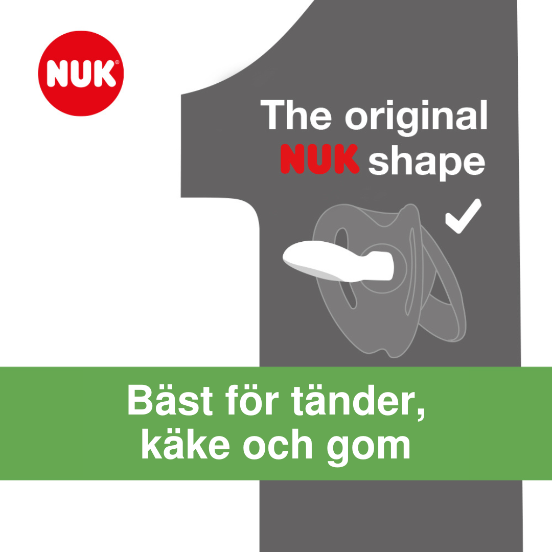 NUK napp i silikon är ergonomiskt utformade för att passa det lilla barnets anatomi. Tillverkad i mjuk silikon. NUK Air System gör att luft kan strömma fritt genom sugdelen. Detta gör att nappen behåller sin form för att minska belastning på barnets käkar.