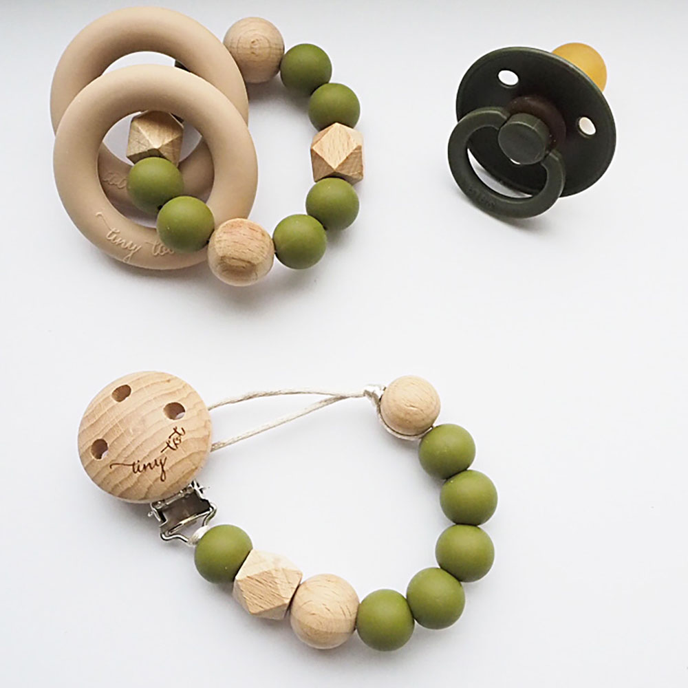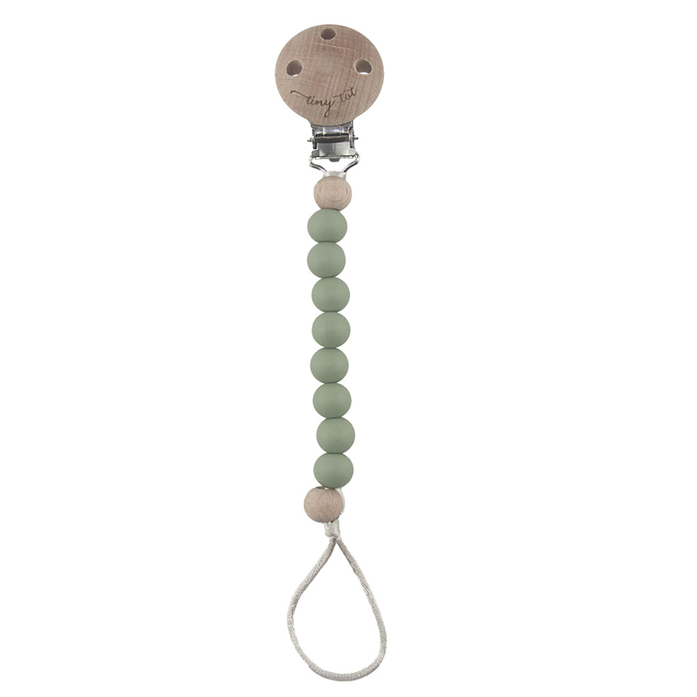 Tillverkad av 100% livsmedelsklassat silikon, fritt från BPA och ftalater, samt handpolerade träpärlor ger den en söt och unik design. Den är perfekt för att matcha ditt barns kläder och hålla nappen på plats och blir en fin liten sak för bebis att tugga på.