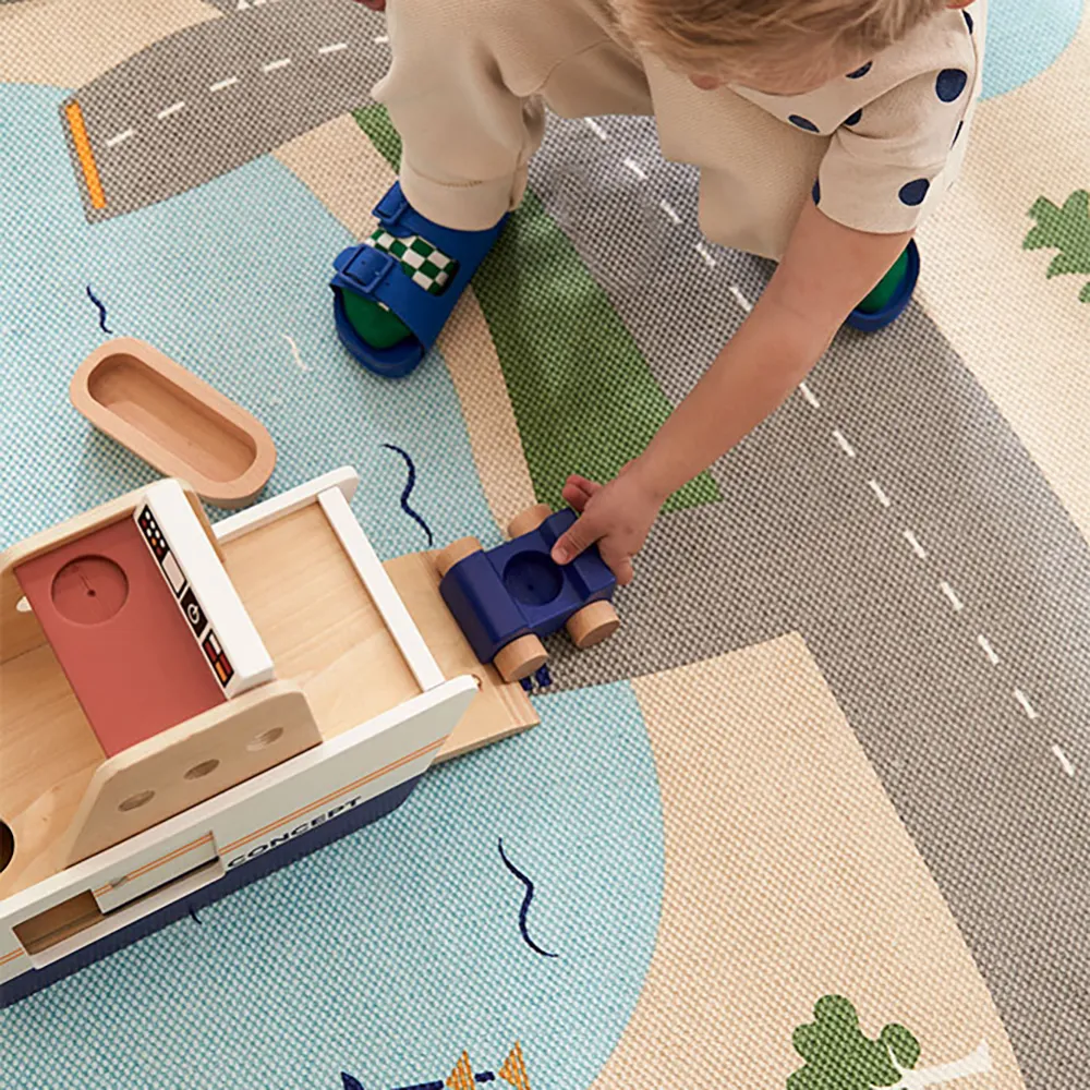 Välkommen till Aiden City – en hel värld för lek på en mjuk, inbjudande matta! Denna matta erbjuder en härlig plats för barnens fantasifyllda lekar, med ett landskap som inkluderar en sjö där invånarna kan simma, njuta av picknick eller resa med färjan och bilarna från Aiden Concept. Mattan är en perfekt bas för att låta färjor och bilar komma till liv, där varje detalj inspirerar till kreativ lek och äventyr.