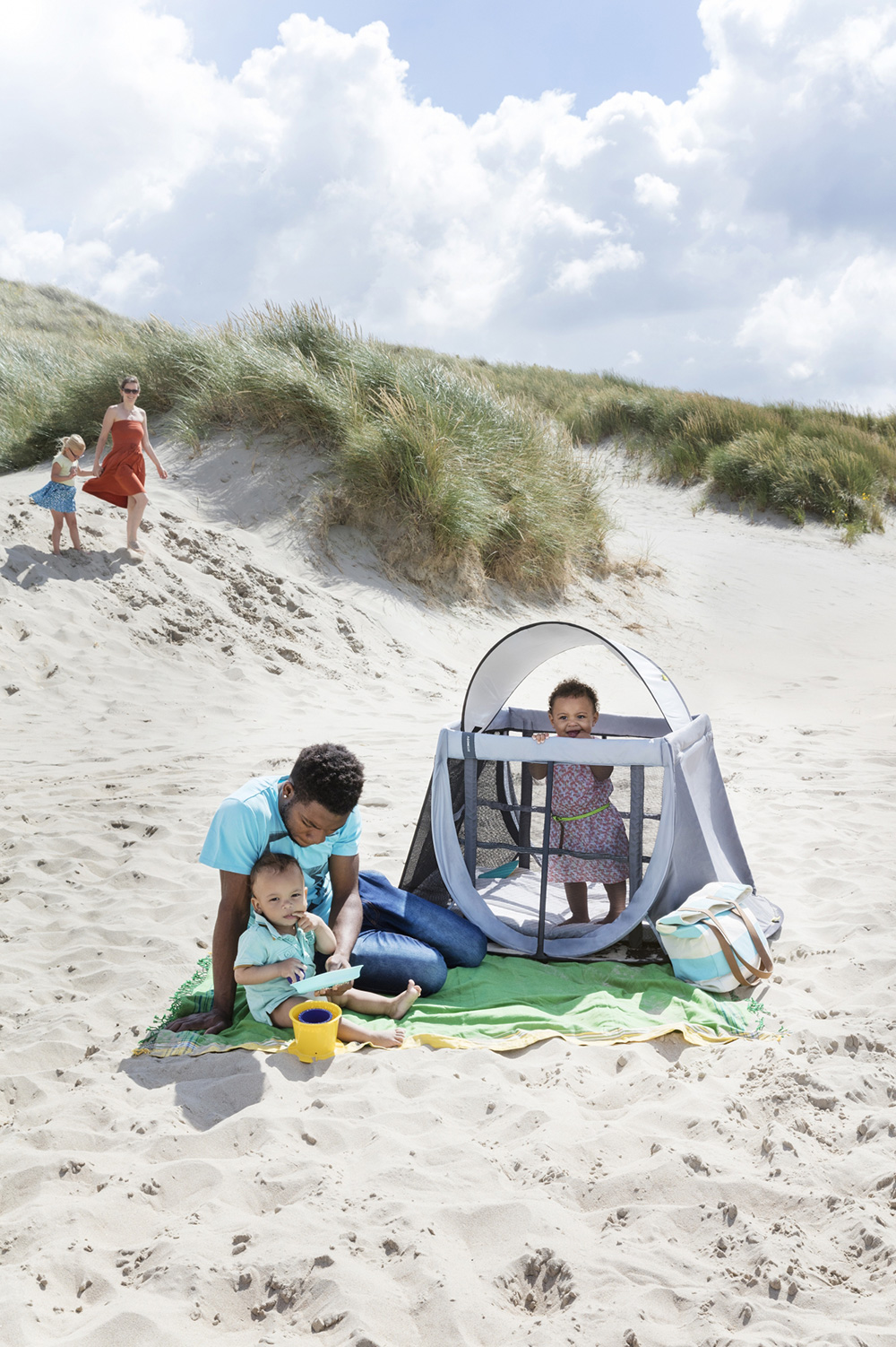 Praktiskt UV-solskydd till AeroMoov PopUp resesäng som fästs vid sängens ändar. Går att vrida för maximalt skydd för barnet.