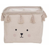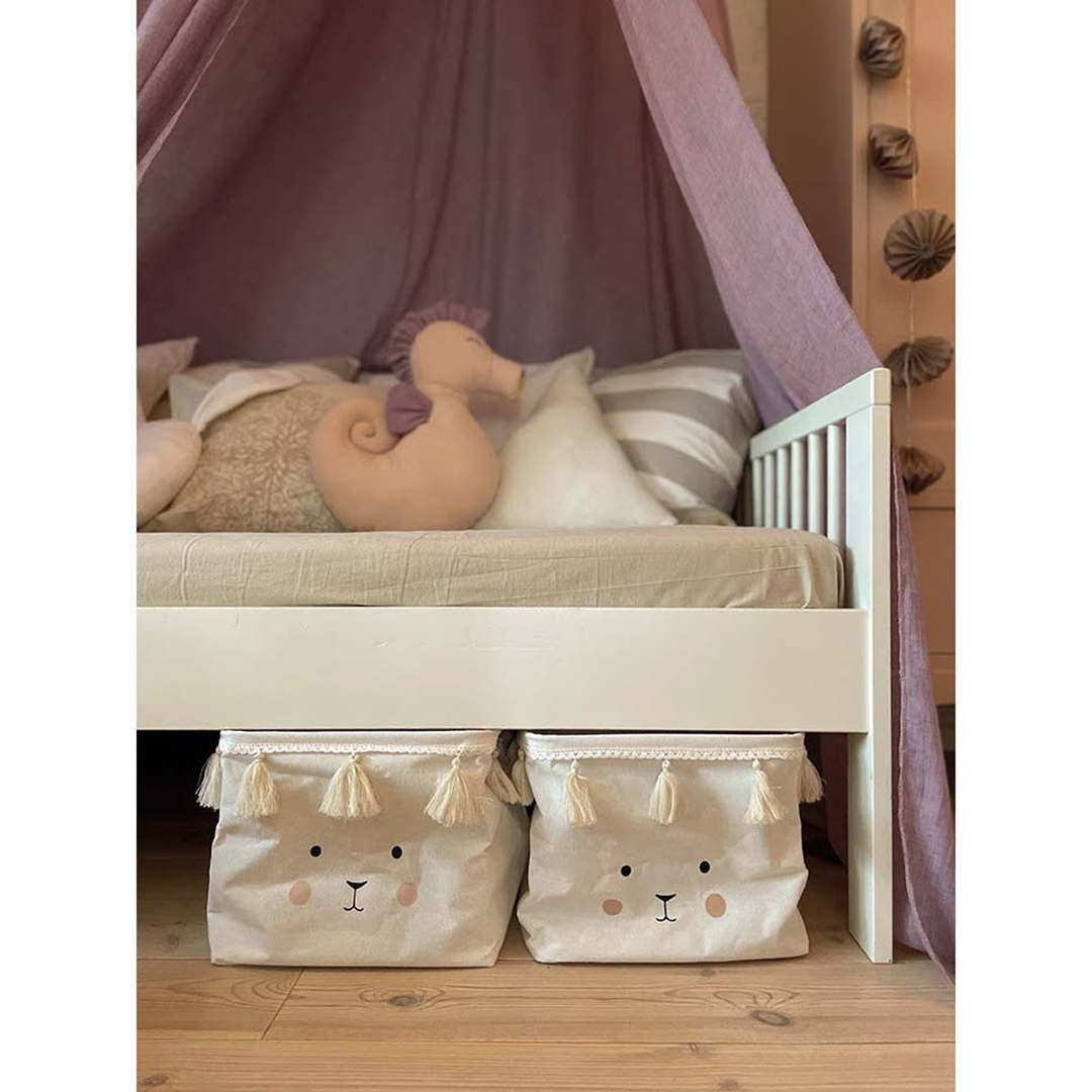 Gör det enkelt för ditt barn att organisera sina leksaker med dessa förvaringskorgar som är både praktiska och användarvänliga. Korgarna kan också användas i hallen för att förvara halsdukar, mössor och vantar på ett organiserat sätt. Dessa korgar blir också en snygg inredningsdetalj i barnrummet och kan matchas med våra tygvimplar för att skapa en komplett tema. På ena sidan av korgen finns en söt teddybjörn med toffsar som hänger runtomkring.