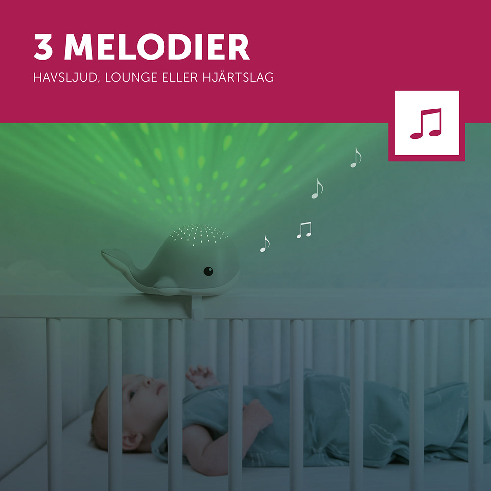 Wally kan även spela lugnande melodier, havsljud, hjärtljud och vaggvisor och har en automatiskt avstängning.