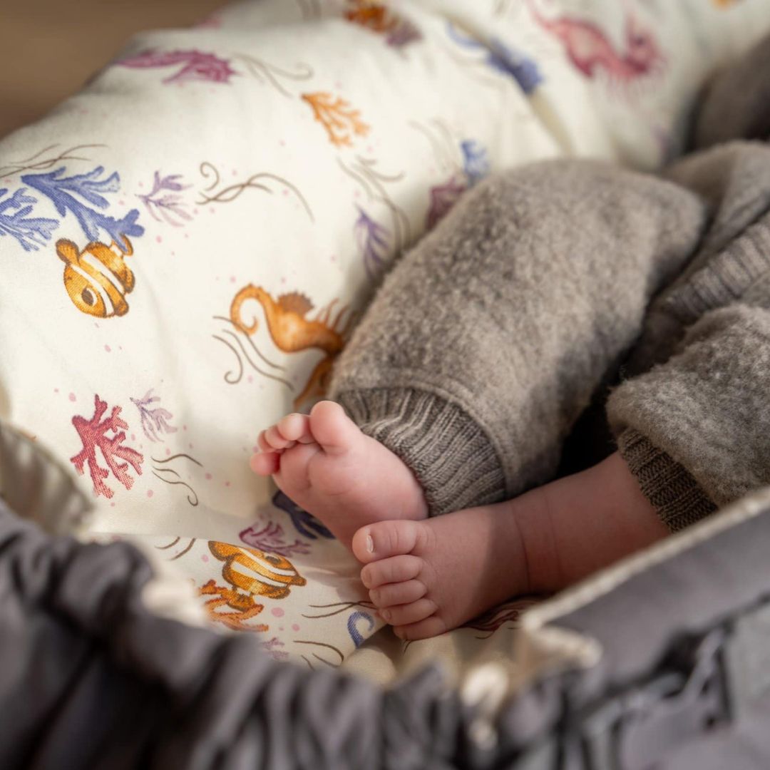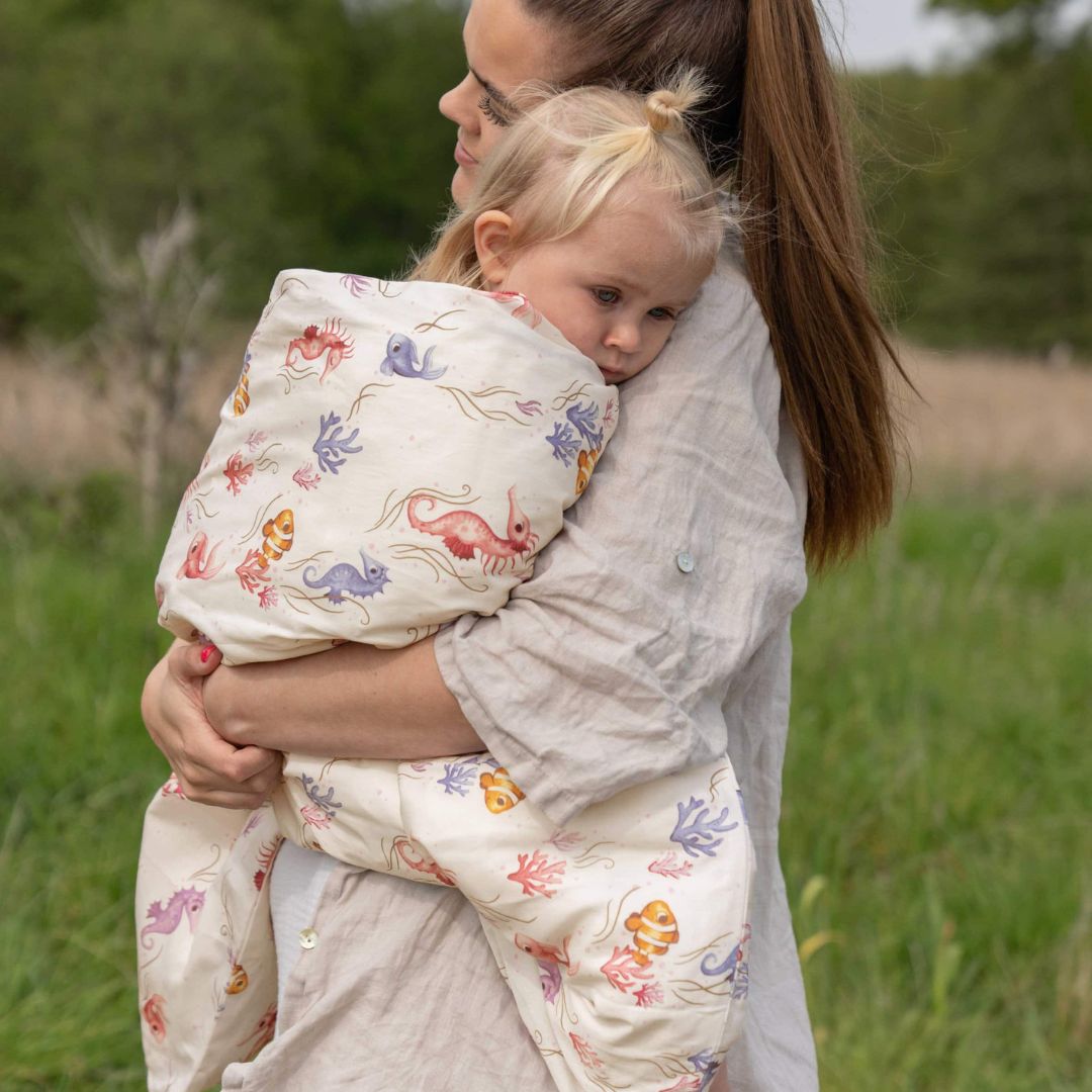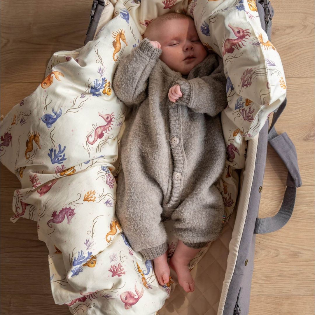 Efter en riktigt rolig dag på stranden känner du dig väldigt sömnig, men aldrig tillräckligt sömnig för att somna direkt. Under havet finns ett magiskt land som våra graciösa sjöhästar skulle älska att ta dig till. Hoppa bara upp på deras ryggar och rid genom det ljusa och färgglada korallrevet i dina drömmar. Våra sängkläder är tillverkade av ekologisk GOTS-certifierad bomull, vilket gör detta set till ditt barns extra mjuka favorit. Setet innehåller ett örngott med kuvertstängning och ett påslakan som kan öppnas och stängas med band. Dina nya sängkläder levereras i en matchande tygväska, som är lika bra för förvaring av sängkläderna som för att vara din vackra accessoar när du är på språng. Örngott: 40 x 45 cm Påslakan: 70 x 100cm Ålder från (månader): 0-12 Tvättråd: Maximal krympning 5%. Tvätta med samma färger Vanlig tvätt i 40 grader Får inte blekas Strykning på medelvärme max 150 grader Torktumling på låg värme max 50 grader Material 100% GOTS-certifierad ekologisk bomull Färg: Beige