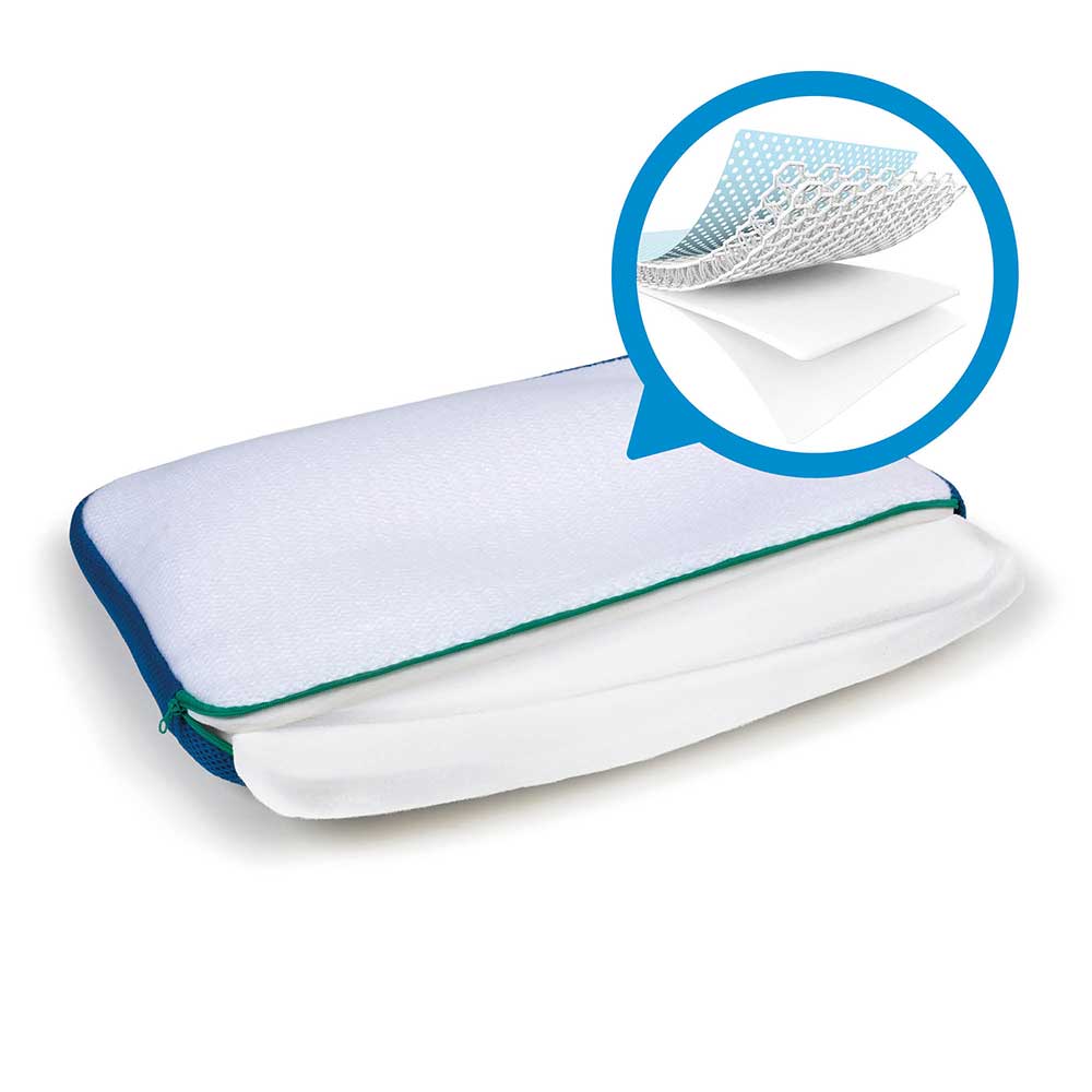Kudden består av tre lager Det första lagret med 3D-strukturen andas och leder all vätska, t.ex. saliv, till det andra, uppsugande lagret, som håller kvar all fukt. Det nedre lagret är vattentätt, och ser till att fyllning och säng förblir ren.