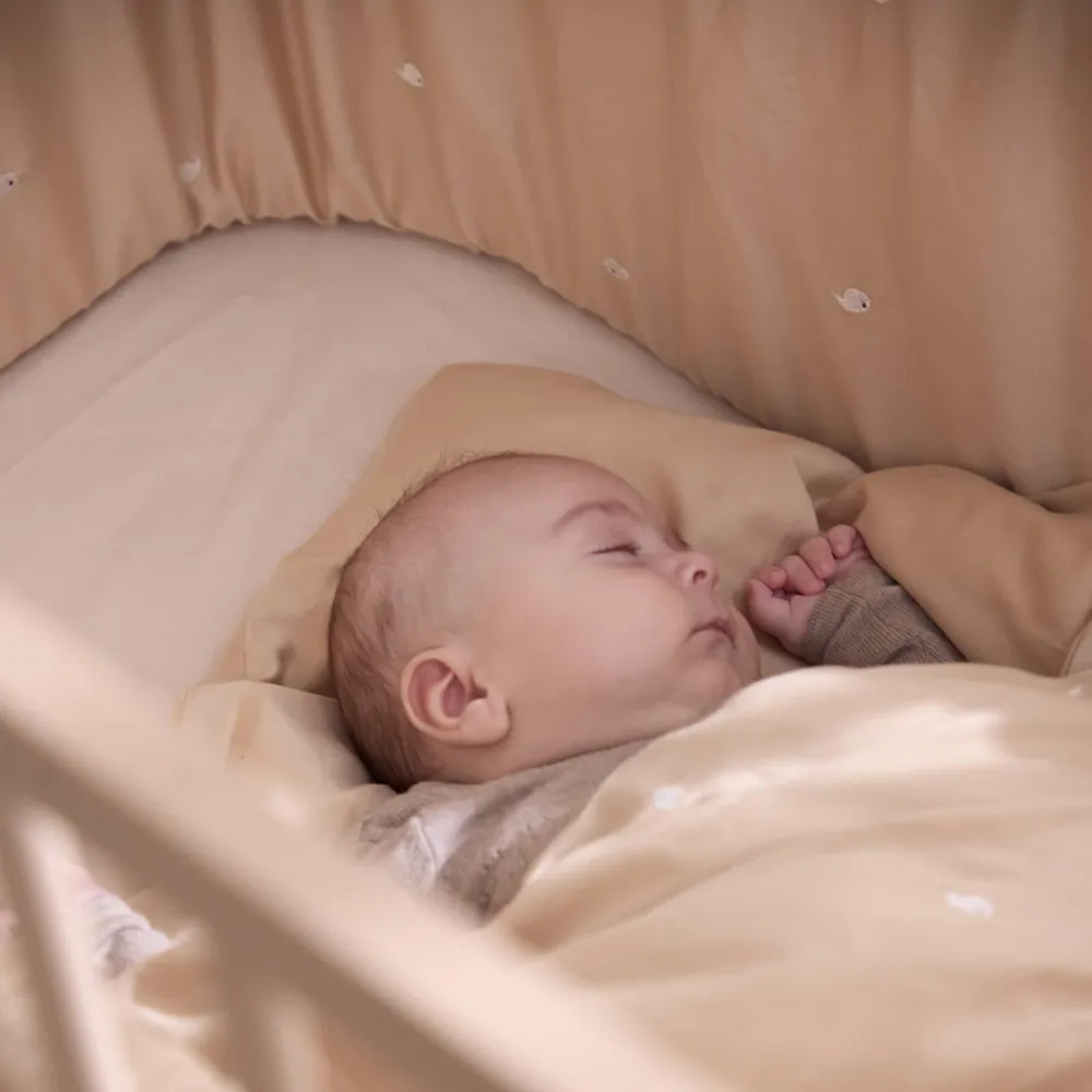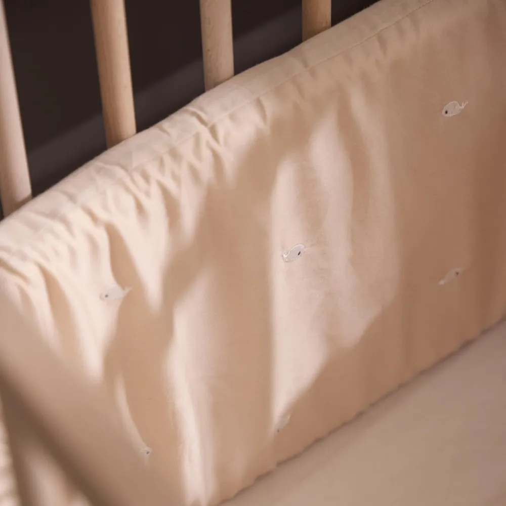 Mys ner i Filibabbas mjuka bäddmadrass, tillverkad i GOTS-certifierad ekologisk bomull och dekorerad med vackra broderier av den ikoniska Christian the Whale-designen, för en trygg och skön sömn. Filibabbas bumper är speciellt framtagen för att skapa en ombonad och mysig miljö i både spjälsängar och babysängar. Tack vare dess 4 cm tjocka polyesterskumkärna behöver den inte fästas med band, vilket gör den både säker och praktisk. Den tjocka kvaliteten skyddar ditt barn från att stöta huvudet mot spjälorna, medan den avtagbara dragkedjan gör det enkelt att tvätta överdraget. Om sängen är mindre kan bumpern anpassas genom att överlappa kanterna.