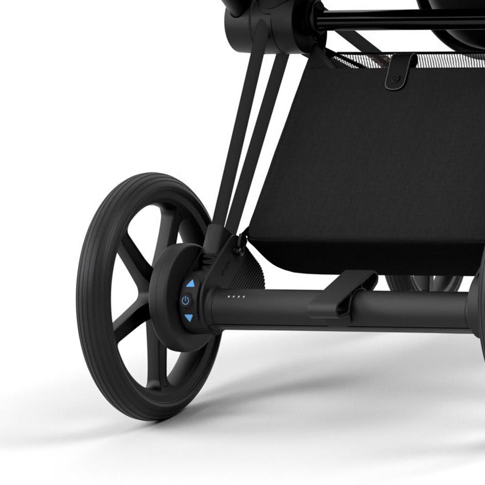 Cybex e-Priam har smarta hjälpfunktioner i form av sensorer integrerade i handtaget känner av hur mycket tryck du använder för att skjuta/dra vagnen vilket innebär att i en nedförsbacke anpassar den sig efter din fart. Gå nedför utan någon som helst ansträngning och skulle du släppa vagnen så stannar denna av sig själv.