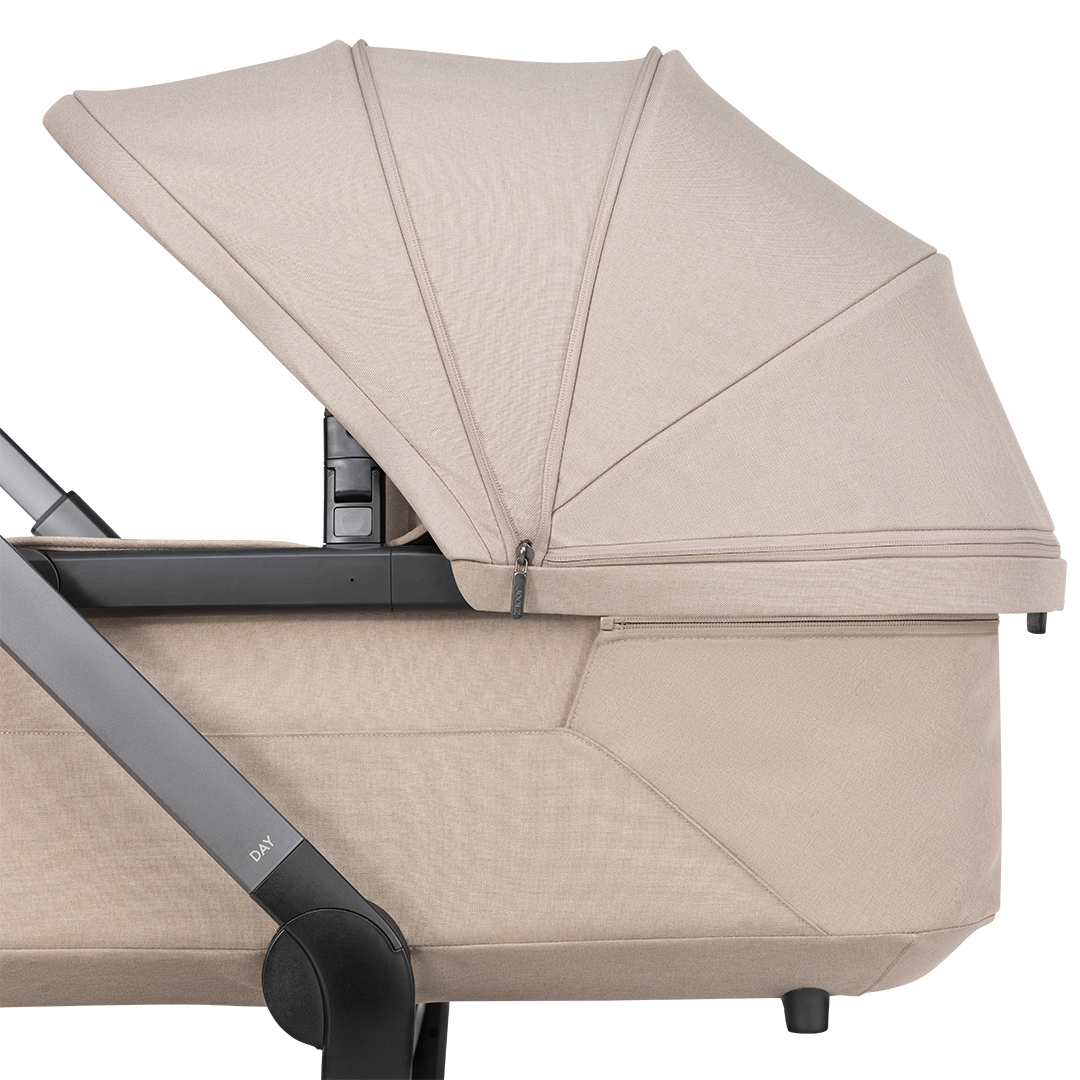 Joolz Day5 levereras med en rymlig liggdel som erbjuder generöst utrymme för ditt barn att sträcka ut sig. Madrassen har förbättrad bottenventilation och är tillverkad av TencelTM lyocell, vilket skapar en mjuk och andningsbar sovyta. Dess upphöjda position gör det enklare för föräldrar att interagera med sina barn och minskar belastningen på ryggen. Vid behov kan du även köpa extra adaptorer för att höja liggdelen ytterligare.