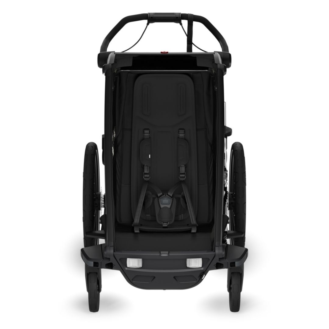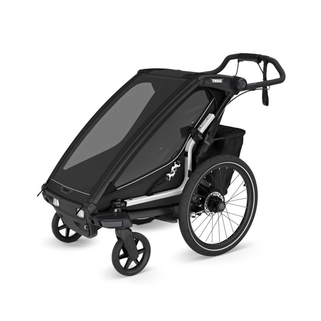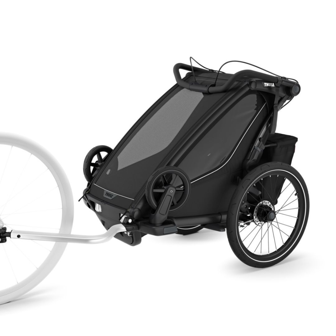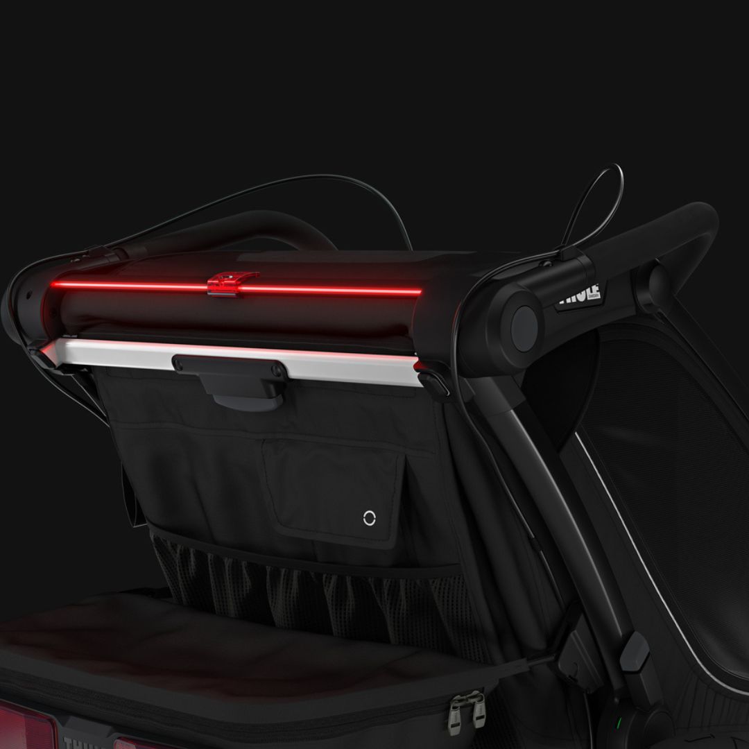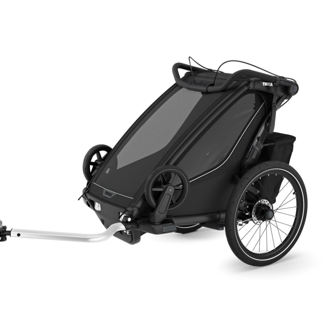Vagnen är hopfällbar med en kompakt och lättanvänd vikmekanism som gör det enklare än någonsin att ta med sig den. Inbyggd LED-belysning (baklykta) förbättrar synligheten och säkerheten i alla förhållanden, tidpunkter och årstider. Den klimatreglerade interiören har avtagbara fönster och solskydd som kan justeras på flera sätt för optimal klimatkontroll. Ventilerna optimerar luftflödet och klimatet, med löstagbara klämmor som ökar ventilationen när regnskyddet används. Thule Click n' Store erbjuder praktisk förvaring av tillbehörskit för promenader, jogging och cykling i olika aktivitetslägen. Vagnen har vagnen bekväma vadderade säten som är löstagbara och enkla att rengöra.