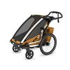 Handaktiverade skivbromsar ger ökad kontroll i brant terräng och under löpning. Det helt vadderade, fällbara sätet ger härlig komfort för sköna tupplurar och kan enkelt fällas ihop även med en hand. FlipWing-funktionen gör det enkelt att växla mellan cykling och promenad genom att vända hjulen upp och ner medan vagnen är fäst vid cykeln. Den nya cykelarmen möjliggör säker och enkel fastsättning och lossning av vagnen på cykeln med bara en hand. Justerbar fjädring gör det möjligt att anpassa komforten när ditt barn växer eller om du transporterar tyngre föremål i vagnen. Den stora lastkorgen med dragkedja erbjuder säker förvaring och kan packas undan för att ge ökat löpstegsutrymme vid löpning.