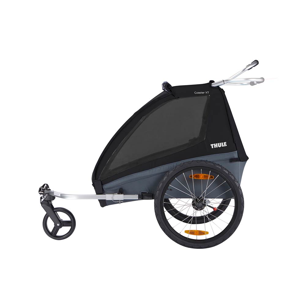 Thule Coaster XT är en tålig cykelvagn som gör åkturen säker och bekväm. När du är framme kan den förvandlas till en barnvagn med hjälp av tillbehör.