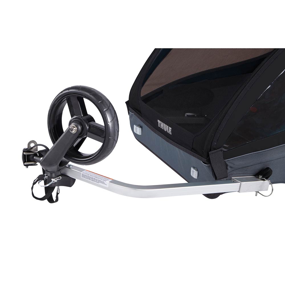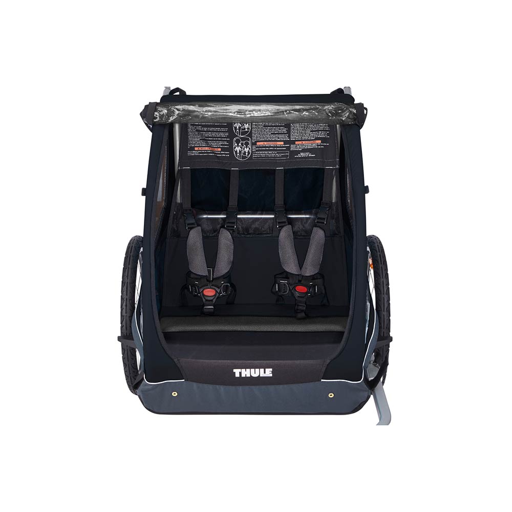 I cykelvagnen finns det plats för både ett och två barn som båda kan spännas fast med 5-punkts sele. Till Thule Coaster XT ingår både promenad och cykelkit.
