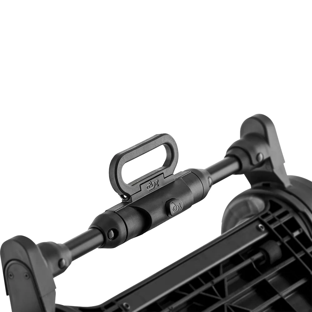 Punkteringsfria däck och fjädring på alla hjul gör att vagnen rullar mjukt även på ojämna underlag. Flip flop-vänlig broms låses och frigörs uppifrån. Den rymliga varukorgen rymmer upp till 5 kg och har extra fickor för småsaker.