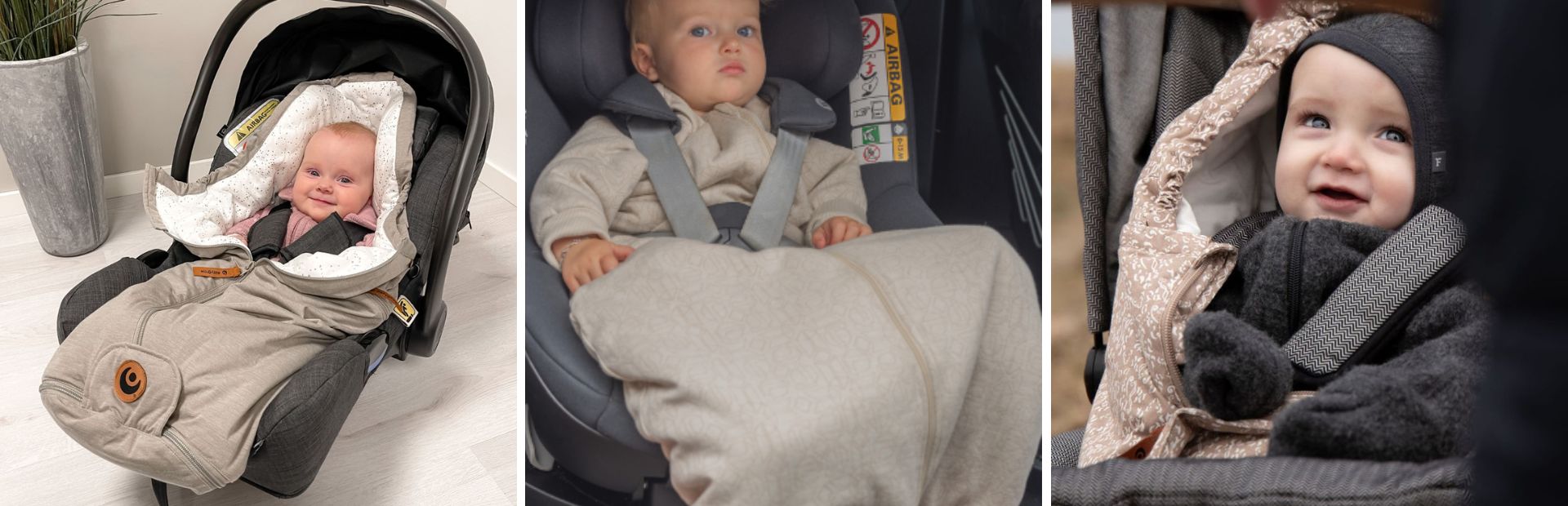 ✓ Använd en åkpåse vår, vinter och höst: Välj en åkpåse som är speciellt designad för babyskydd/bilbarnstol. Dessa är oftast tunna vid barnets baksida och stör inte bilbältet, men håller ändå barnet varmt.