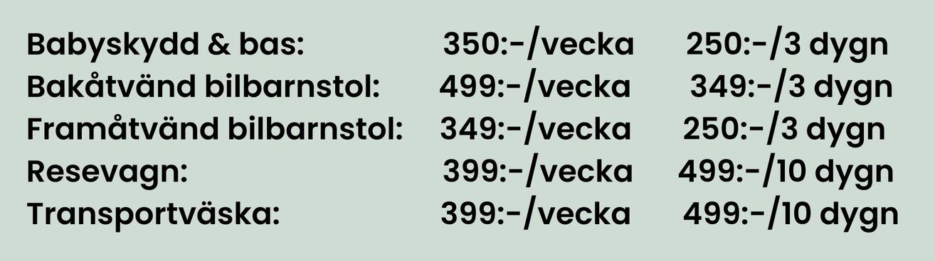 Hos Pyret & Snäckan i Staffanstorp kan du hyra bilbarnstol, resevagn eller transportväska för barnvagn. Kontakta oss via hej@pyretosnackan.se eller 010-3300777 för att boka & kontrollera tillgänglighet. Deposition: 1000:- tas ut (2500:- för bakåtvänd bilbarnstol) Montering av bilbarnstolen i er bil ingår i priset.