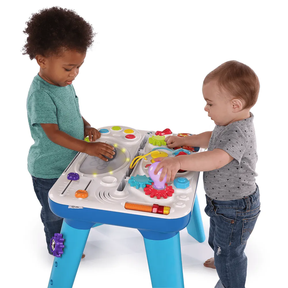 Väck ditt barns naturliga nyfikenhet med Baby Einstein's Curiosity Table! Denna tvåsidiga konst- och vetenskapsbord är fylld med spännande funktioner, från avtagbara snurrande kugghjul till färgupptäckarcirklar och blinkande ljus – allt som fångar ditt barns uppmärksamhet i timmar. Titta på när kugghjulen sätts i rörelse och får glödlampan att lysa! Utforska färger utan kladd med de smarta ”färgburkarna”. Ditt barn kommer att älska att undersöka alla små detaljer och knappar på detta dubbelbord, som spelar upp över 65 melodier och introducerar ord på engelska, spanska och franska. Volymen kan justeras till hög eller låg eller stängas av helt, och med en högkvalitativ högtalare blir ljudupplevelsen ännu bättre.