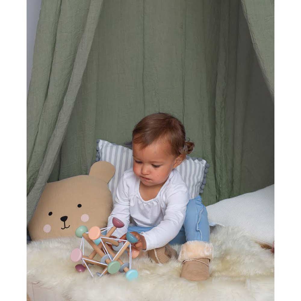 En rolig aktivitetsleksak för de allra minsta som stimulerar många olika sinnen. På de mjuka gummibanden sitter pärlor i trä som går att snurra och dra i. De håller även samman träpinnarna som går att trycka ihop eller dra ut. De många härliga färgerna ger mycket att titta och pilla på för ett litet barn!