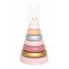 En klassisk stapelleksak i form av en kanin i dova färger. Kaninen har en pinne som man trä klossarna i olika ordningar. Pinnen hålls fast av ett gummiband i bottenplattan av säkerhetsskäl. Längst upp på toppen sitter det en söt kanin. Med hjälp av stapelleksaken kan ditt barn lära sig räkna, urskilja olika färger och storlekar samt öva på motoriken.
