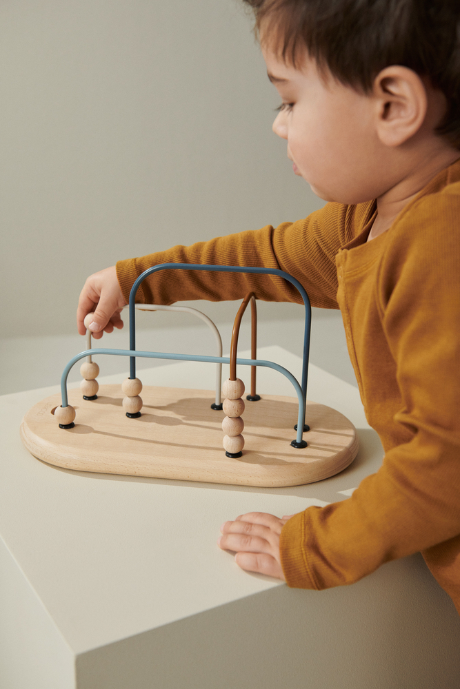 Ronald kulram från Liewood, en klassisk aktivitetsleksak. De kan tyckas enkla för oss vuxna men att leka med en pärlalabyrint förbättrar hand-öga-koordination, visuell spårning, språkutveckling och formigenkänning.
