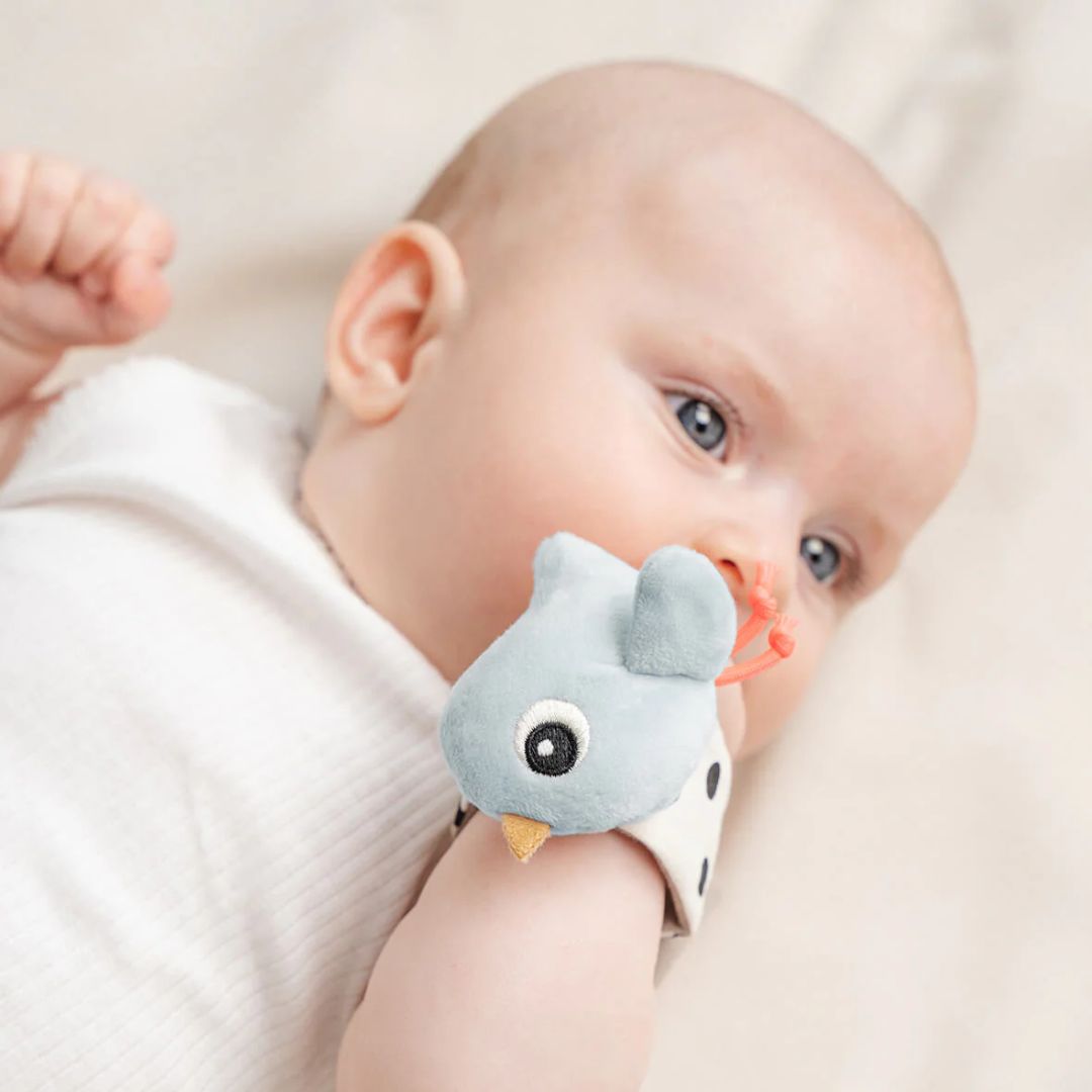 - Lyckliga moln handleds skallra set består av 2 mjuka babyarmband med pulverdetaljer - Rekommenderas från 0 månader - Perfekt för sensorisk stimulering, kroppsmedvetenhet och handigenkänning - Kontrasterande prickar och ränder och färgglada element för visuell stimulering - Skallrande och knastrande ljud stimulerar ditt barn - Ett armband har prickar och en pulverfågel, medan det andra har ränder och en moln - Kardborreknäppning gör det enkelt att sätta på och ta bort skallrorna - Kan användas för både handleder och vrister