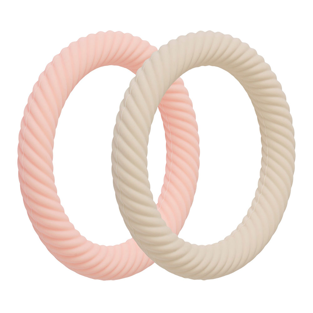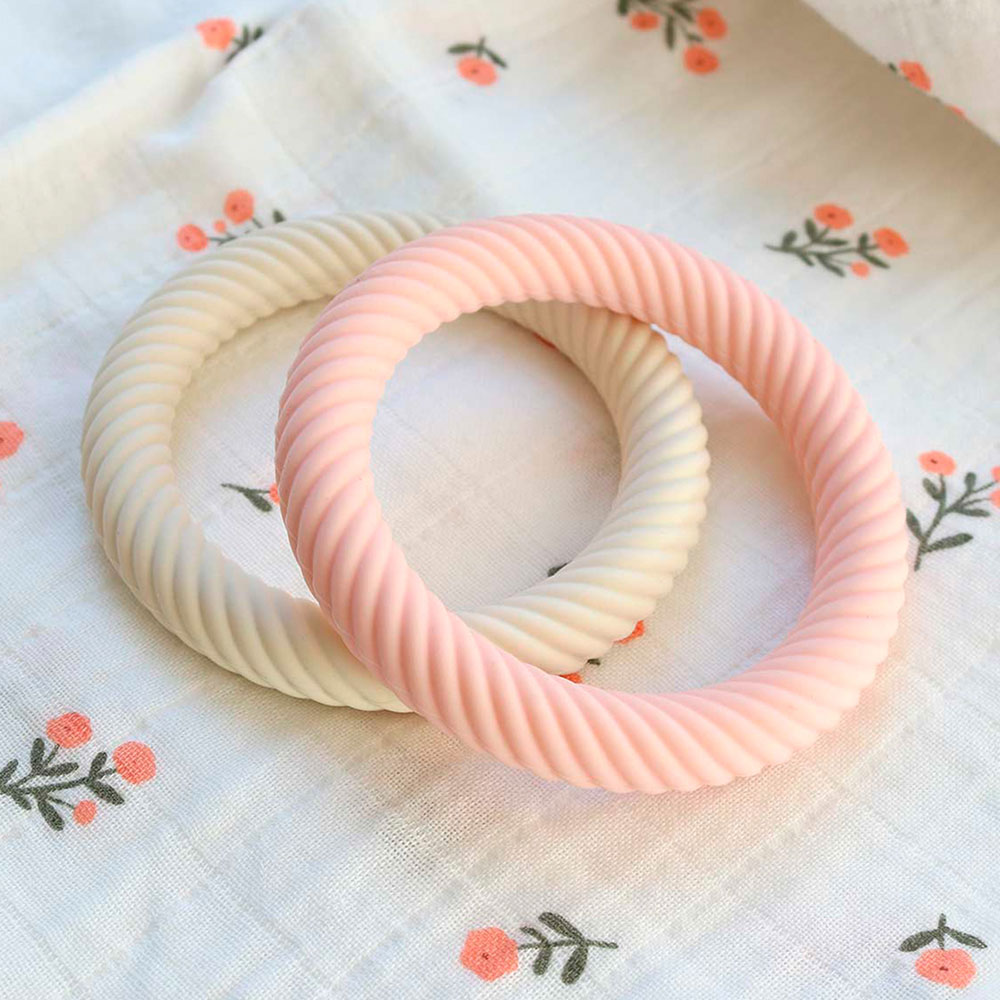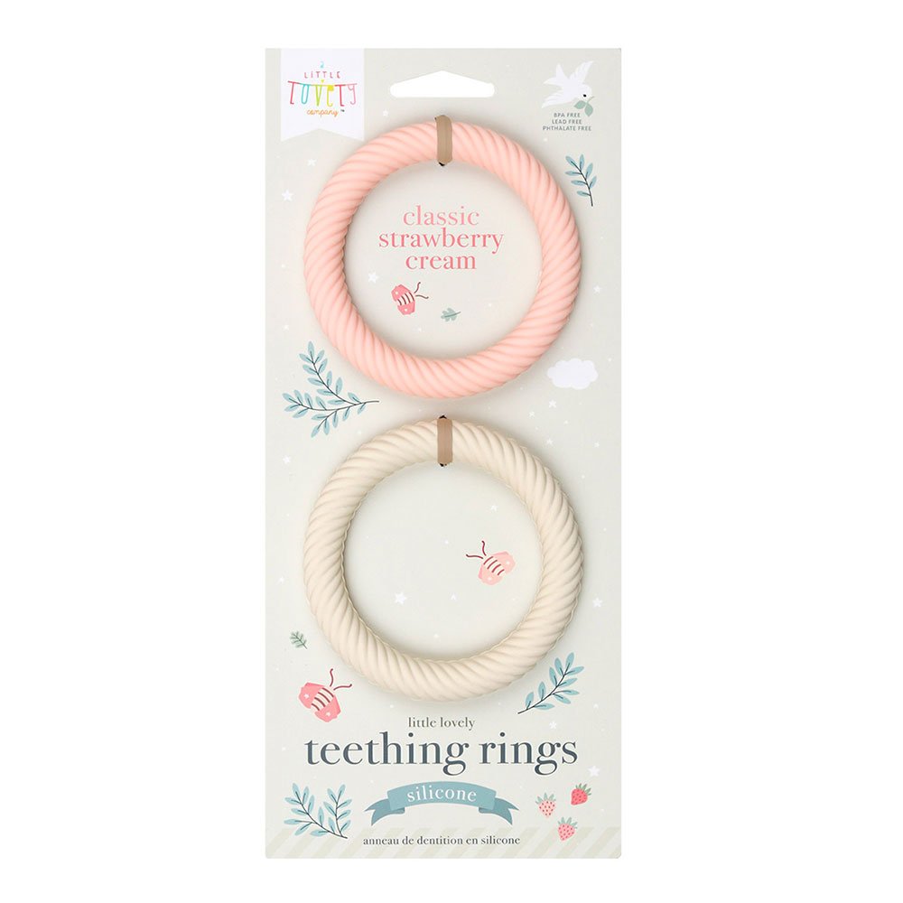 Ett set med två små vackra bitringar. Tillverkade av 100% ofarligt livsmedelsklassat silikon är de idealiska för små händer och lindrar ömma tandkött.