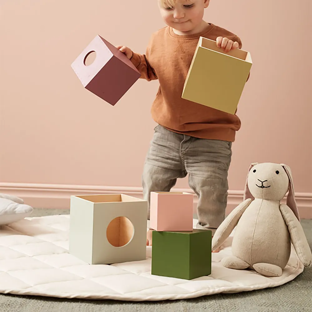 Varje kub är designad för att kunna staplas på och i varandra, vilket ger en spännande och interaktiv lekupplevelse. De allra minsta barnen kommer att älska att utforska och experimentera, medan äldre barn kan använda kuberna som hus till sina leksaksdjur eller som förvaringslådor för sina skatter. Med ett smart hål i varje kub kan de staplas så att de bildar en genomgående struktur – perfekt för att stimulera fantasin!