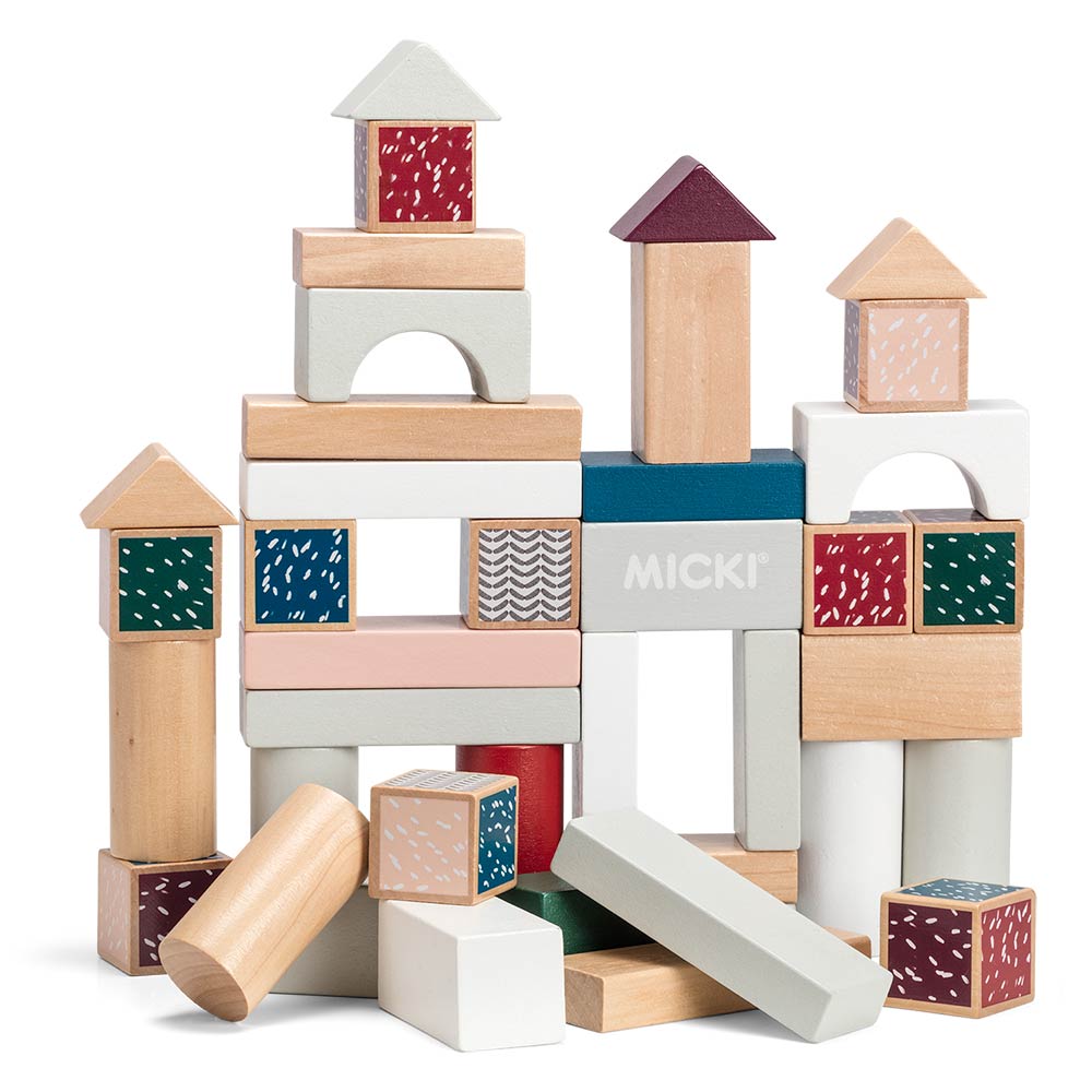 Lekfulla klossar från Micki. Med hela 40 olika klossar i blandade färger och lekfulla mönster erbjuds oändliga lekmöjligheter. Byggklossarna stimulerar barnens fantasi och koordinationsförmåga.