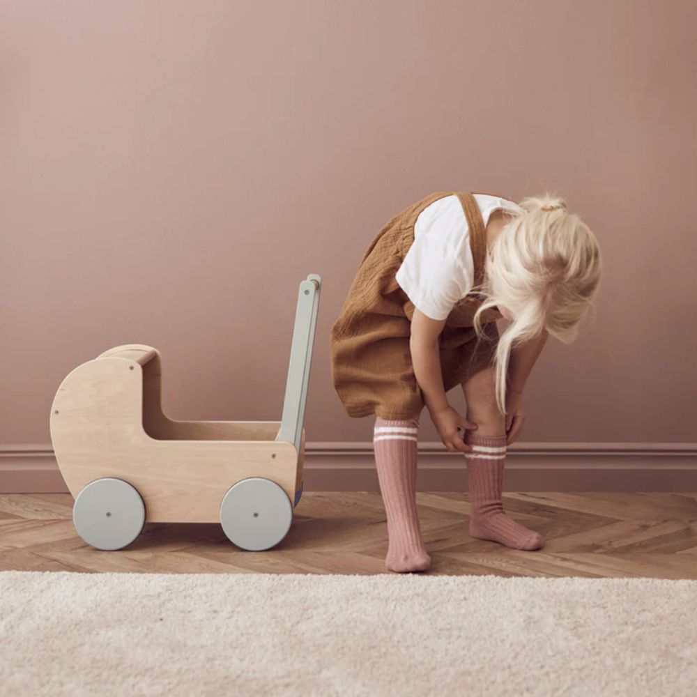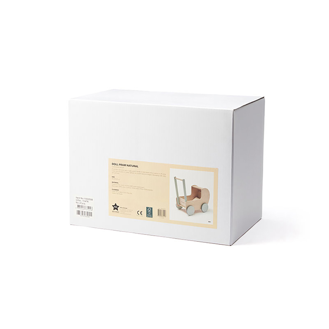 Dockvagn: Plywood av lind, bok. Handtag: Furu, Schima. Hjul: MDF. Textil: Bomull. Fyllning kudde: Polyester. EN71 Tillverkad av FSC-certifierat trä CE-märkt
