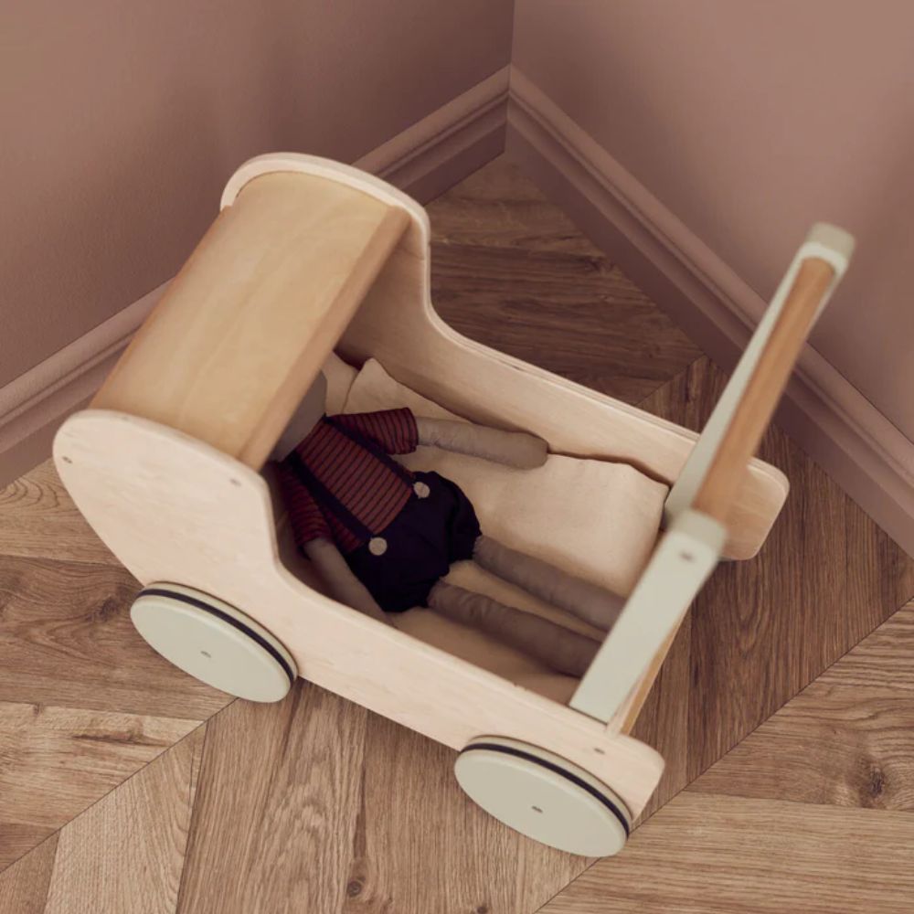 En trä dockvagn i klassisk design med handtag och hjul i mild grön färg som fina detaljer.