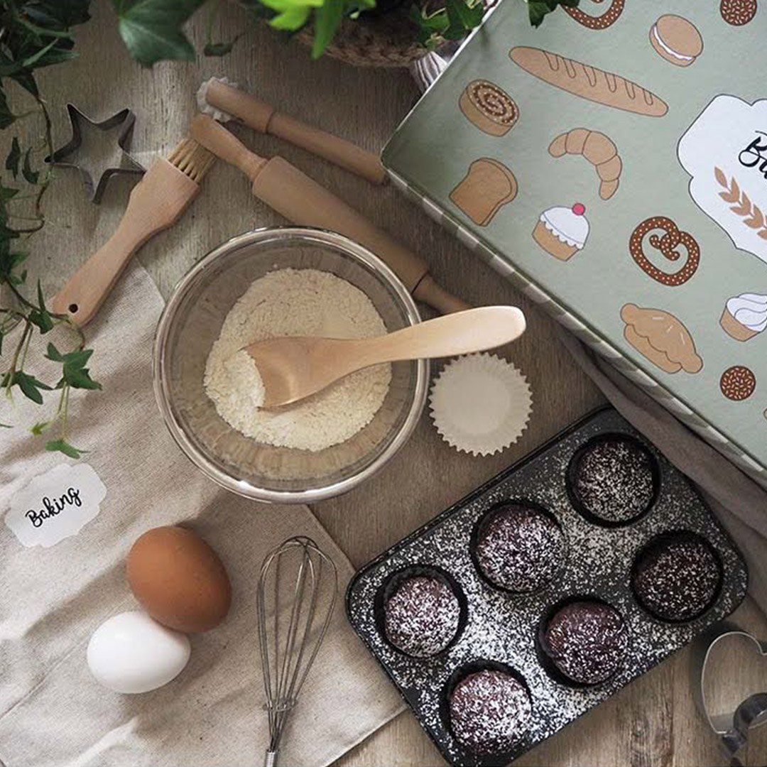 Ett roligt bakset med hela 13 olika delar. I setet finns bland annat kavel, formar, bakplåt och visp. Allt förpackat i en söt grårutig pappväska med matchande bakduk. Ugnsplåten går utmärkt att använda i vanlig ugn för riktig bakning.